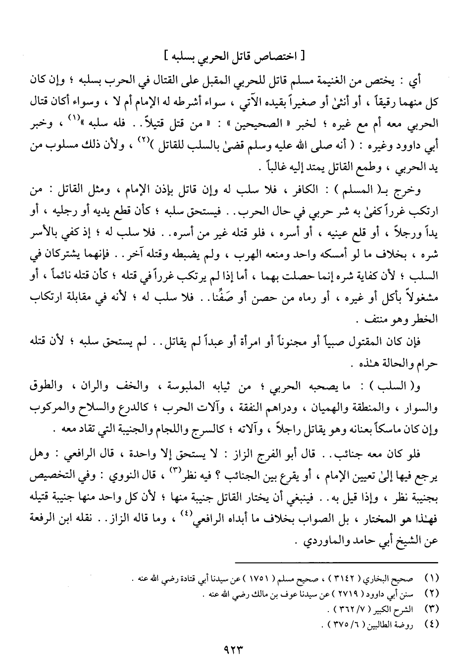 وخرج ب (المسلم): الكافر، فلا سلب له وإن قاتل بإذن الإمام، ومثل القاتل: من ارتكب غرراً كفى به شر حربي في حال الحرب .. فيستحق سلبه؛ كأن قطع يديه أو رجليه، أو يداً ورجلاً، أو قلع عينيه، أو أسره، فلو قتله غير من أسره .. فلا سلب له؛ إذا كفي بالأسر شره؛ بخلاف ما لو أمسكه واحد ومنعه الهرب، ولم يضبطه وقتله آخر ... فإنهما يشتركان في السلب؛ لأنه كفاية شره إنما حصلت بهما، أما إذا لم يرتكب غرراً في قتله؛ كأن قتله نائماً، أو مشغولاً بأكل أو غيره، أو رماه من حصن أو صفنا .. فلا سلب له؛ لأنه في مقابلة ارتكاب الخطر وهو منتف.