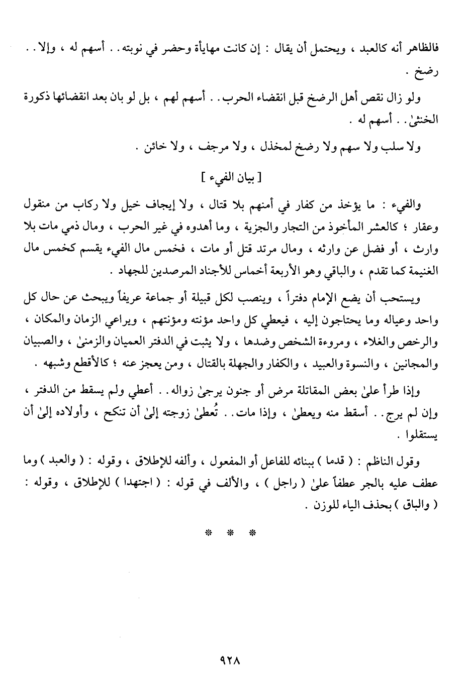 والفيء: ما يؤخذ من كفار في أمنهم بلا قتال، ولا إيجاف خيل ولا ركاب من منقول وعقار، كالعشر المأخوذ من التجار والجزية، وما أهدوه في غير الحرب، ومال ذمي مات بلا وارث، أو فضل عن وارثه، ومال مرتد قتل أو مات، فخمس مال الفيء يقسم كخمس مال الغنيمة كما تقدم، والباقي وهو الأربعة أخماس للأجناد المرصدين للجهاد.