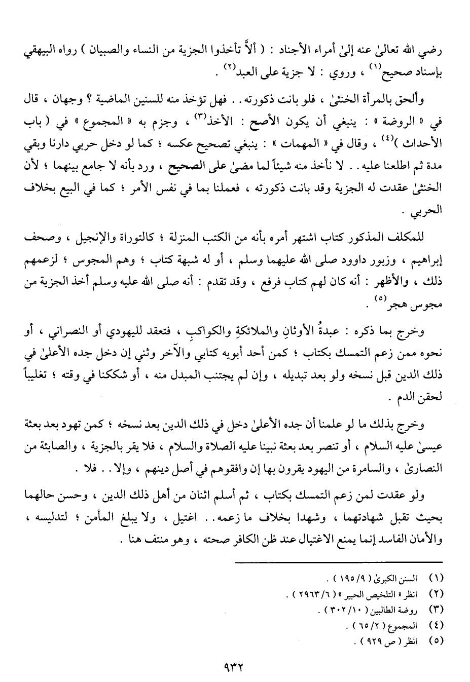 رضي الله تعالى عنه إلى أمراء الأجناد: (ألا تأخذوا الجزية من النساء والصبيان) رواه البيهقي بإسناد صحيح, وروي: لا جزية على العبد. وألحق بالمرأة الخنثى, فلو بانت ذكورته .. فهل تؤخذ منه للسنين الماضية؟ وجهان, قال في "الروضة": ينبغي أن يكون الأصح: الأخذ, وجزم به "المجموع" في (باب الأحداث) , وقال في "المهمات": ينبغي تصحيح عكسه؛ كما لو دخل حربي دارنا وبقي مدة ثم اطلعنا عليه .. لا نأخذ منه شيئاً لما مضى على الصحيح, ورد بأنه لا جامع بينهما؛ لأن الخنثى عقدت له الجزية وقد بانت ذكورته, فعملنا بما في نفس الأمر؛ كما في البيع بخلاف الحربي. للمكلف المذكور كتاب اشتهر أمره بأنه من الكتب المنزلة؛ كالتوراة والإنجيل, وصحف إبراهيم, وزبور داوود صلى الله عليهما وسلم, أو له شبهة كتاب؛ وهم المجوس؛ لزعمهم ذلك, والأظهر: أنه كان لهم كتاب فرفع, وقد تقدم: صلى الله عليه وسلم أخذ الجزية من مجوس هجر. وخرج بما ذكره: عبدة الأوثان والملائكة والكواكب, فتعقد لليهودي أو النصراني, أو نحوه ممن زعم التمسك بكتاب؛ كمن أحد أبوية كتابي والآخر وثني إن دخل جده الأعلى في ذلك الدين قبل نسخه ولو بعد تبديله, وإن لم يجتنب المبدل منه, أو شككنا في وقته؛ تغليباً لحقن الدم. وخرج بذلك ما لو علمنا أن جده الأعلى دخل في ذلك بعد نسخه؛ كمن تهود بعد بعثة عيسى عليه السلام, أو تنصر بعد بعثة نبينا عليه الصلاة والسلام, فلا يقر بالجزية, والصائبة من النصارى, والسامرة من اليهود يقرون بها إن وافقوهم في أصل دينهم, وإلا .. فلا. ولو عقدت لمن زعم التمسك بكتاب, ثم أسلم اثنان من أهل ذلك الدين, وحسن حالهما بحيث تقبل شهادتهما, وشهدا بخلاف ما زعمه .. اغتيل, ولا يبلغ المأمن؛ لتدليسه, والأمان الفاسد إنما يمنع الاغتيال عند ظن الكافر صحته, وهو منتف هنا.