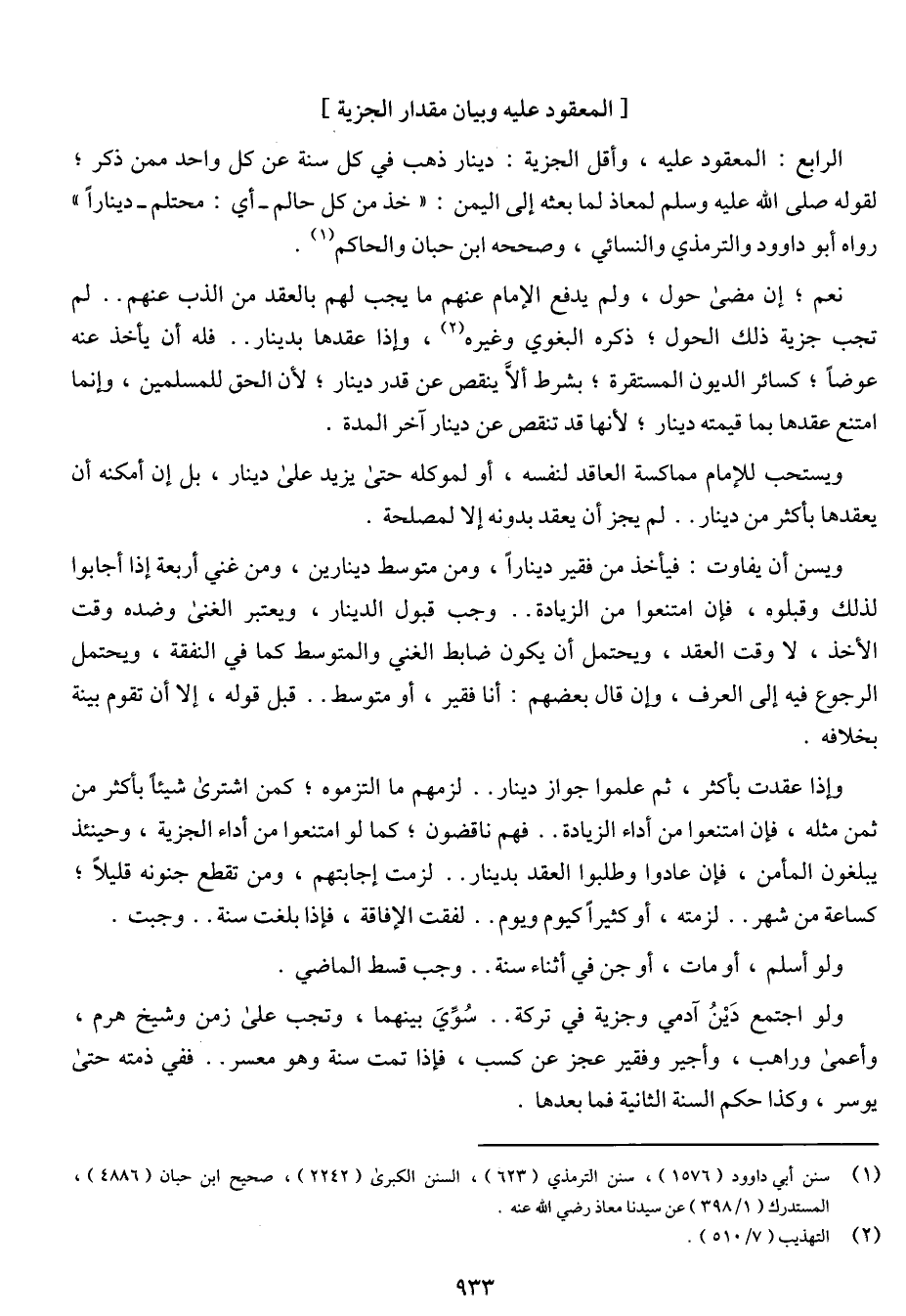 الرابع: المعقود عليه, وأقل الجزية: دينار ذهب في كل سنة عن كل واحد ممن ذكر؛ لقوله صلى الله عليه وسلم لمعاذ لما بعثه إلى اليمن: "خذ من كل حالم- أي: محتلم-ديناراً" رواه أبو داوود والترمذي والنسائي, وصححه ابن حبان والحاكم. نعم؛ إن مضى حول, ولم يدفع الإمام عنهم ما يجب لهم بالعقد من الذب عنهم .. لم تجب جزية ذلك الحول؛ ذكره البغوي وغيره, وإذا عقدها بدينار .. فله أن يأخذ عنه عوضاً؛ كسائر الديون المستقرة؛ بشرط ألا ينقص عن قدر دينار؛ لأن الحق للمسلمين, وإنما امتنع عقدها بما قيمته دينار؛ لأنها قد تنقص عن دينار آخر المدة. ويستحب للإمام مماكسة العاقد لنفسه, أو لموكله حتى يزيد على دينار, بل إن أمكنه أن يعقدها بأكثر من دينار .. لم يجز أن يعقد بدونه إلا لمصلحة. ويسن أن يفاوت: فيأخذ من فقير ديناراً, ومن متوسط دينارين, ومن غني أربعة إذا أجابوا لذلك وقبلوه, فإن امتنعوا من الزيادة .. وجب قبول الدينار, ويعتبر الغنى وضده وقت الأخذ, لا وقت العقد, ويحتمل أن يكون ضابط الغني والمتوسط كما في النفقة, ويحتمل الرجوع فيه إلى العرف, وإن قال بعضهم: أنا فقير, أو متوسط .. قبل قوله, إلا أن تقوم بينة بخلافه. وإذا عقدت بأكثر, ثم علموا جواز دينار .. لزمهم ما التزموه؛ كمن اشترى شيئاً بأكثر من ثمن مثله, فإن امتنعوا من أداء الزيادة .. فهم ناقضون؛ كما لو امتنعوا من أداء الجزية, وحينئذ يبلغون المأمن, فإن عادوا وطلبوا العقد بدينار .. لزمت إجابتهم, ومن تقطع جنونه قليلاً؛ كساعة من شهر .. لزمته, أو كثيراً كيوم ويوم .. لفقت الإفاقة, فإذا بلغت سنة .. وجبت. ولو أسلم, أو مات, أو جن في أثناء سنة .. وجب قسط الماضي. ولو اجتمع دين آدمي وجزية في تركة .. سوي بينهما, وتجب على زمن وشيخ هرم, وأعمى وراهب, وأجير وفقير عجز عن كسب, فإذا تمت سنة وهو معسر .. ففي ذمته حتى يوسر, وكذا حكم السنة الثانية فما بعدها.