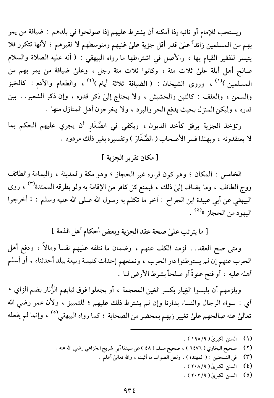 الخامس: المكان؛ وهو كون قراره غير الحجاز؛ وهو مكة والمدينة, واليمامة والطائف ووج الطائف, وما يضاف إلى ذلك, فيمنع كل كافر من الإقامة به ولو بطرقه الممتدة, روى البيهقي عن أبي عبيدة ابن الجراح: آخر ما تكلم به رسول الله صلى الله عليه وسلم: : أخرجوا اليهود من الحجاز".