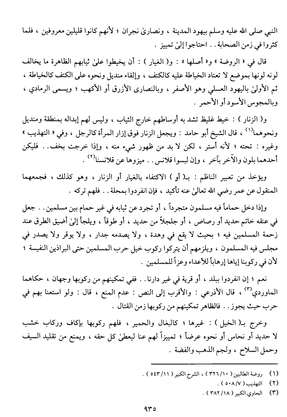 النبي صلى الله عليه وسلم بيهود المدينة, ونصارى نجران؛ لأنهم كانوا قليلين معروفين, فلما كثروا في زمن الصحابة .. احتاجوا إلى تمييز. قال في "الروضة" و"أصلها": و (الغيار): أن يخيطوا على ثيابهم الظاهرة ما يخالف لونه لونها بموضع لا تعتاد الخياطة عليه كالكتف, وإلقاء منديل ونحوه على الكتف كالخياطة, ثم الأولى باليهود العسلي وهو الأصفر, وبالنصارى الأزرق أو الأكهب؛ ويسمى الرمادي, وبالمجوس الأسود أو الأحمر. و (الزنار): خيط غليظ تشد به أوساطهم خارج الثياب, وليس لهم إبداله بمنطقة ومنديل ونحوهما, قال الشيخ أبو حامد: ويجعل الزنار فوق إزار المرأة كالرجل, وفي "التهذيب" وغيره: تحته؛ لأنه استر, لكن لابد من ظهور شيء منه, وإذا خرجت بخف .. فليكن أحدهما بلون والآخر بآخر, وإن لبسوا قلانس .. ميزوها عن قلانسنا. ويؤخذ من تعبير الناظم: بـ (أو) الاكتفاء بالغيار أو الزنار, وهو كذلك, فجمعهما المنقول عن عمر رضي الله تعالى عنه تأكيد, فإن انفردوا بمحلة .. فلهم تركه. وإذا دخل حماماً فيه مسلمون متجرداً, أو تجرد عن ثيابه في غير حمام بين مسلمين .. جعل في عنقه خاتم حديد أو رصاص, أو جلجلاً من حديد, أو طوقاً, ويلجأ إلى أضيق الطرق عند زحمة المسلمين فيه؛ بحيث لا يقع في وهدة, ولا يصدمه جدار, ولا يوقر ولا يصدر في مجلس فيه المسلمون, ويلزمهم أن يتركوا ركوب خيل حرب المسلمين حتى البراذين النفسية؛ لأن في ركوبنا إياها إرهاباً للأعداء وعزاً للمسلمين. نعم؛ إن انفردوا ببلد, أو قرية في غير دارنا .. ففي تمكينهم من ركوبها وجهان, حكاهما الماوردي, قال الأذرعي: والأقرب إلى النص: عدم المنع, قال: لو استعنا بهم في حرب حيث يجوز .. فالظاهر تمكينهم من ركوبها زمن القتال. وخرج بـ (الخيل): وغيرها؛ كالبغال والحمير, فلهم ركوبها بإكاف وركاب خشب لا حديد أو نحاس أو نحوه عرضاً؛ تمييزاً لهم عنا ليعطى كل حقه, ويمنع من تقليد السيف وحمل السلاح, ولجم الذهب والفضة.