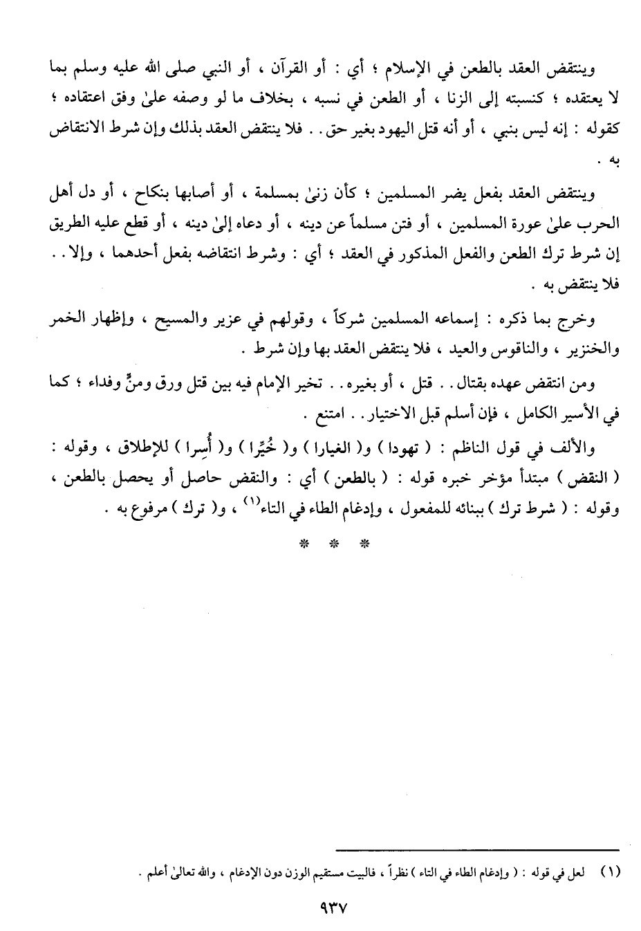 وينتقض العقد بالطعن في الإسلام؛ أي: أو القرآن, أو النبي صلى الله عليه وسلم بما لا يعتقده؛ كنسبته إلى الزنا, أو الطعن في نسبه, بخلاف ما لو وصفه على وفق اعتقاده؛ كقوله: إنه ليس بنبي, أو أنه قتل اليهود بغير حق .. فلا ينتقض العقد بذلك وإن شرط الانتقاض به. وينتقض العقد بفعل يضر المسلمين؛ كأن زنى بمسلمة, أو أصابها بنكاح, أو دل أهل الحرب على عورة المسلمين, أو فتن مسلماً عن دينه, أو دعاه إلى دينه, أو قطع عليه الطريق إن شرط ترك الطعن والفعل المذكور في العقد؛ أي: وشرط انتقاضه بفعل أحدهما, وإلا .. فلا ينتقض به. وخرج بما ذكره: إسماعه المسلمين شركاً, وقولهم في عزير والمسيح, وإظهار الخمر والخنزير, والناقوس والعيد, فلا ينتقض العقد بها وإن شرط. ومن انتقض عهده بقتال .. قتل, أو بغيره .. تخير الإمام فيه بين قتل ورق ومن وفداء؛ كما في الأسير الكامل, فإن أسلم قبل الاختيار .. امتنع. والألف في قول الناظم: (تهودا) و (الغيارا) و (خيرا) و (أسرا) للإطلاق, وقوله: (النقض) مبتدأ مؤخر خبره قوله: (بالطعن) أي: والنقض حاصل أو يحصل بالطعن, وقوله: (شرط ترك) ببنائه للمفعول, وإدغام الطاء في التاء, و (ترك) مرفوع به.