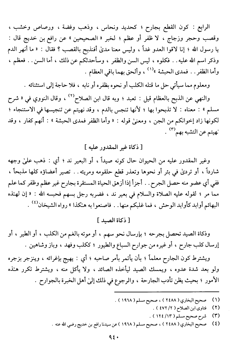 الرابع: كون القطع بجارح؛ كحديد ونحاس, وذهب وفضة, ورصاص وخشب, وقصب وحجر وزجاج, لا ظفر أو عظم؛ لخبر "الصحيحين" عن رافع بن خديج قال: يا رسول الله؛ إنا لاقوا العدو غداً, ليس معنا مدى أفنذبح بالقصب؟ فقال: "ما أنهر الدم وذكر اسم الله عليه .. فكلوه, ليس السن والظفر, وسأحدثكم عن ذلك, أما السن .. فعظم, وأما الظفر .. فمدى الحبشة", وألحق بهما باقي العظام. ومعلوم مما سيأتي حل ما قتله الكلب أو نحوه بظفره أو نابه, فلا حاجة إلى استثنائه. والنهي عن الذبح بالعظام قيل: تعبد؛ وبه قال ابن الصلاح, وقال النووي في "شرح مسلم": معناه: لا تذبحوا بها؛ لأنها تنجس بالدم, وقد نهيتم عن تنجيسها في الاستنجاء؛ لكونها زاد إخوانكم من الجن, ومعنى قوله: "وأما الظفر فمدى الحبشة": أنهم كفار, وقد نهيتم عن التشبيه بهم.