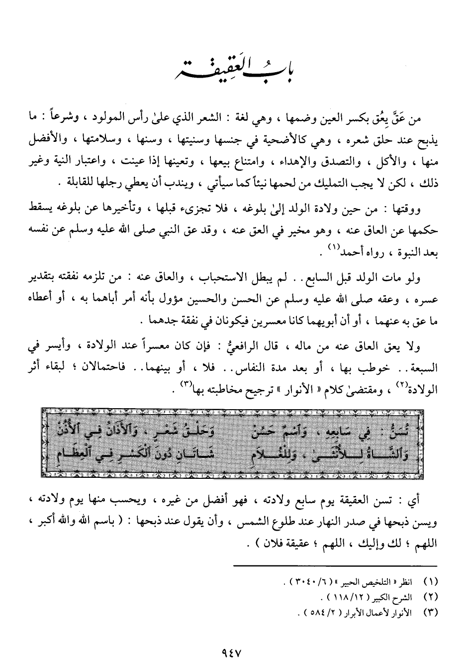 أي: تسن العقيقة يوم سابع ولادته, فهو أفضل من غيره, ويحسب منها يوم ولادته, ويسن ذبحها في صدر النهار عند طلوع الشمس, وأن يقول عند ذبحها: (باسم الله والله أكبر, اللهم؛ لك وإليك, اللهم؛ عقيقة فلان).