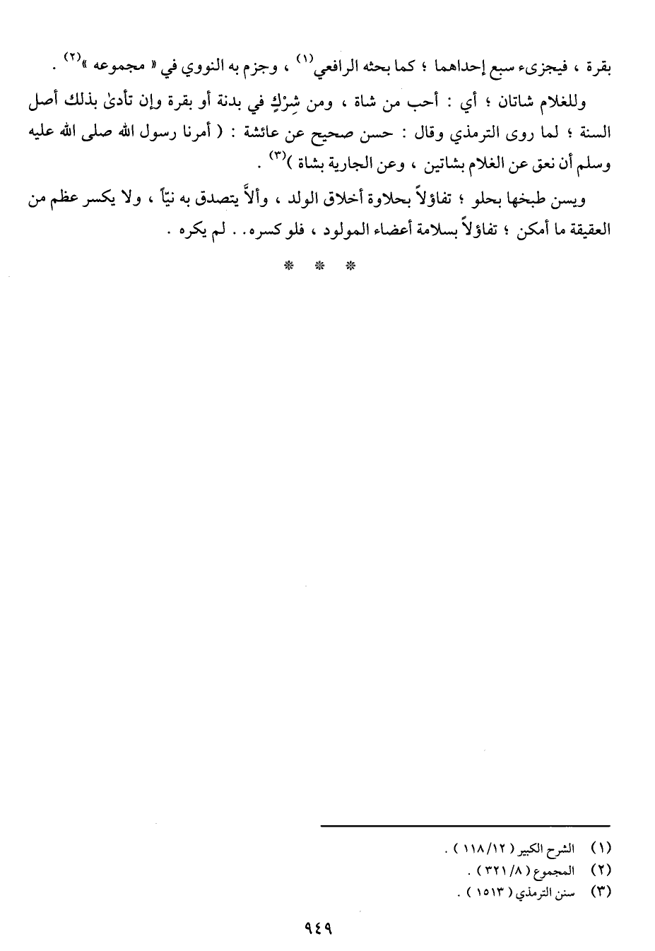 وللغلام شاتان؛ أي: أحب من شاة, ومن شِرك في بدنة أو بقرة وإن تأدى بذلك أصل السنة؛ لما روى الترمذي وقال: حسن صحيح عن عائشة: (أمرنا رسول الله صلى الله عليه وسلم أن نعق عن الغلام بشاتين, وعن الجارية بشاة).