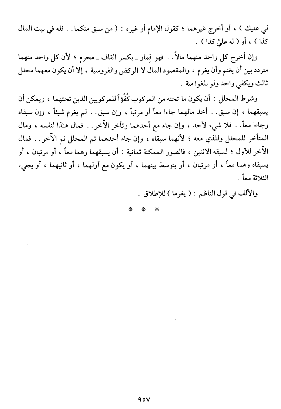 وإن أخرج كل واحد منهما مالاً .. فهو قمار – بكسر القاف – محرم؛ لأن كل واحد منهما متردد بين أن يغنم وأن يغرم، والمقصود المال لا الركض والفروسية، إلا أن يكون معهما محلل ثالث ويكفي واحد ولو بلغوا مئة.