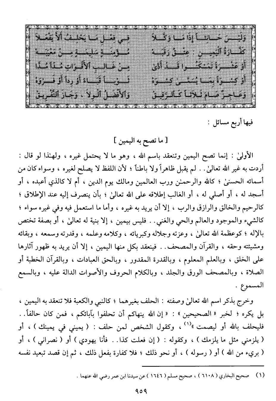 الأولى: إنما تصح اليمين وتنعقد باسم الله، وهو ما لا يحتمل غيره، ولهذا لو قال: أردت به غير الله تعالى .. لم يقبل ظاهراً ولا باطناً؛ لأن اللفظ لا يصلح لغيره، وساء كان من أسمائه الحسنى؛ كالله والرحمن ورب العالمين ومالك يوم الدين، أم لا كالذي أعبده، أو أسجد له، أو أصلي له، أو الغالب إطلاقه على الله تعالى؛ بأن ينصرف إليه عند الإطلاق؛ كالرحيم والخالق والرازق والرب، إلا أن يريد به غيره، وأما ما استعمل فيه وفي غيره سواء؛ كالشيء والموجود والعالم والحي والغني .. فليس بيمين، إلا بنية له تعالى، أو بصفة تختص بالإله؛ كوعظمة الله تعالى، وعزته وجلاله وكبريائه، وكلامه وعلمه، وقدرته وسمعه، وبقائه ومشيئته وحقه، والقرآن والمصحف .. فينعقد بكل منها اليمين، إلا أن يريد به ظهور آثارها على الخلق، وبالعلم المعلوم، وبالقدرة المقدور، وبالحق العبادات، وبالقرآن الخطبة أو الصلاة، وبالمصحف الورق والجلد، وبالكلام الحروف والأصوات الدالة عليه، وبالسمع المسموع.