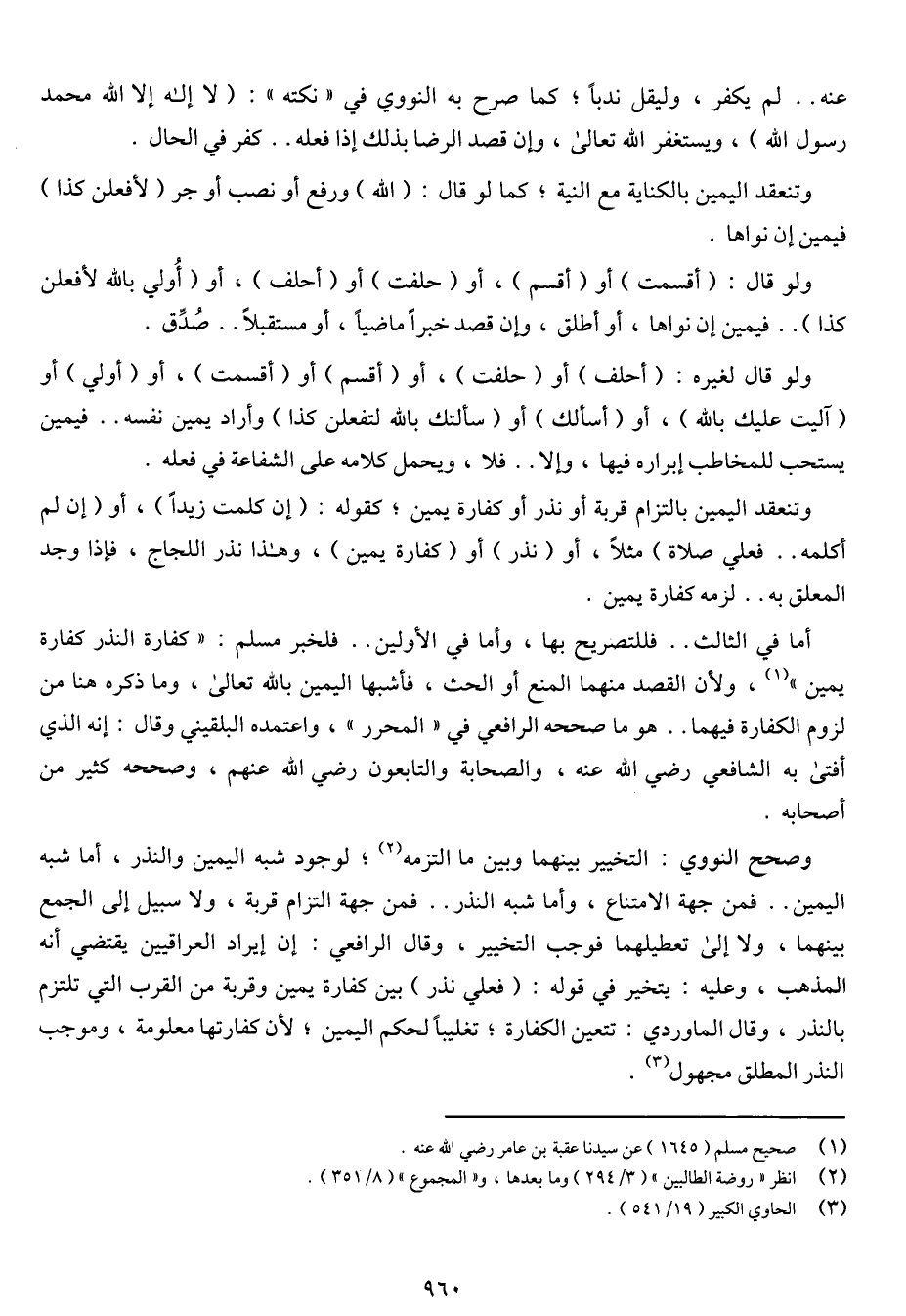وأما في الثالث .. فللتصريح بها، أما في الأولين .. فلخبر مسلم: "كفارة النذر كفارة يمين"، ولأن القصد منهما المنع أو الحث، فأشبها اليمين بالله تعالى، وما ذكره هنا من لزوم الكفارة فيهما .. هو ما صححه الرافعي في "المحرر"، واعتمده البلقيني وقال: إنه الذي أفتى به الشافعي رضي الله عنه، والصحابة والتابعون رضي الله عنهم، وصححه كثير من أصحابه.