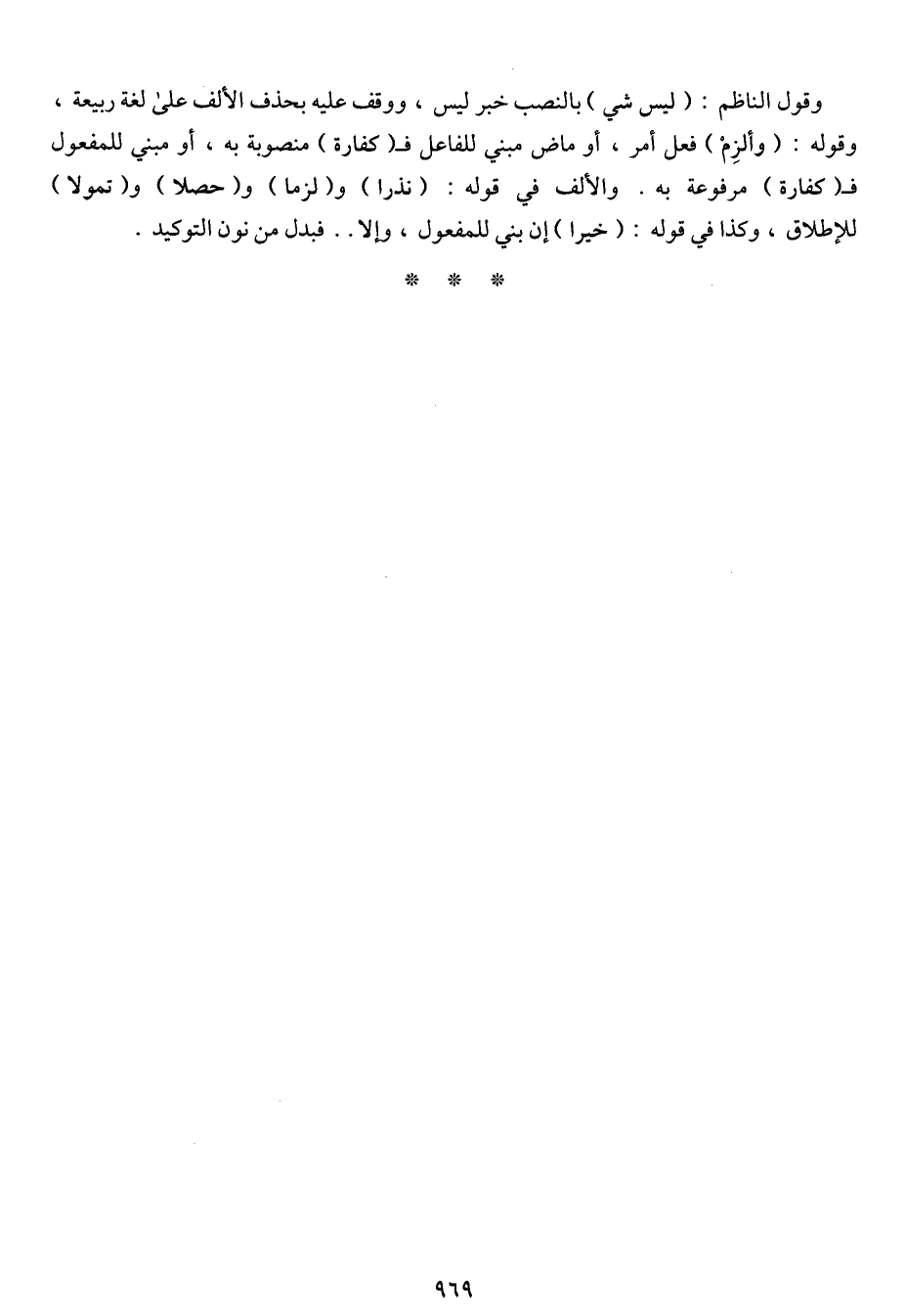 وقول الناظم: (ليس شيء) بالنصب خبر ليس، ووقف عليه بحذف الألف على لغة ربيعة، وقوله: (وألزم) فعل أمر، أو ماض مبني للفاعل فـ (كفارة) منصوبة به، أو مبني للمفعول فـ (كفارة) مرفوعة به. والألف في قوله: (نذرا) و (لزما) و (حصلا) و (تمولا) للإطلاق، وكذا في قوله: (خيرا) إن بني للمفعول، وإلا .. فبدل من نون التوكيد.