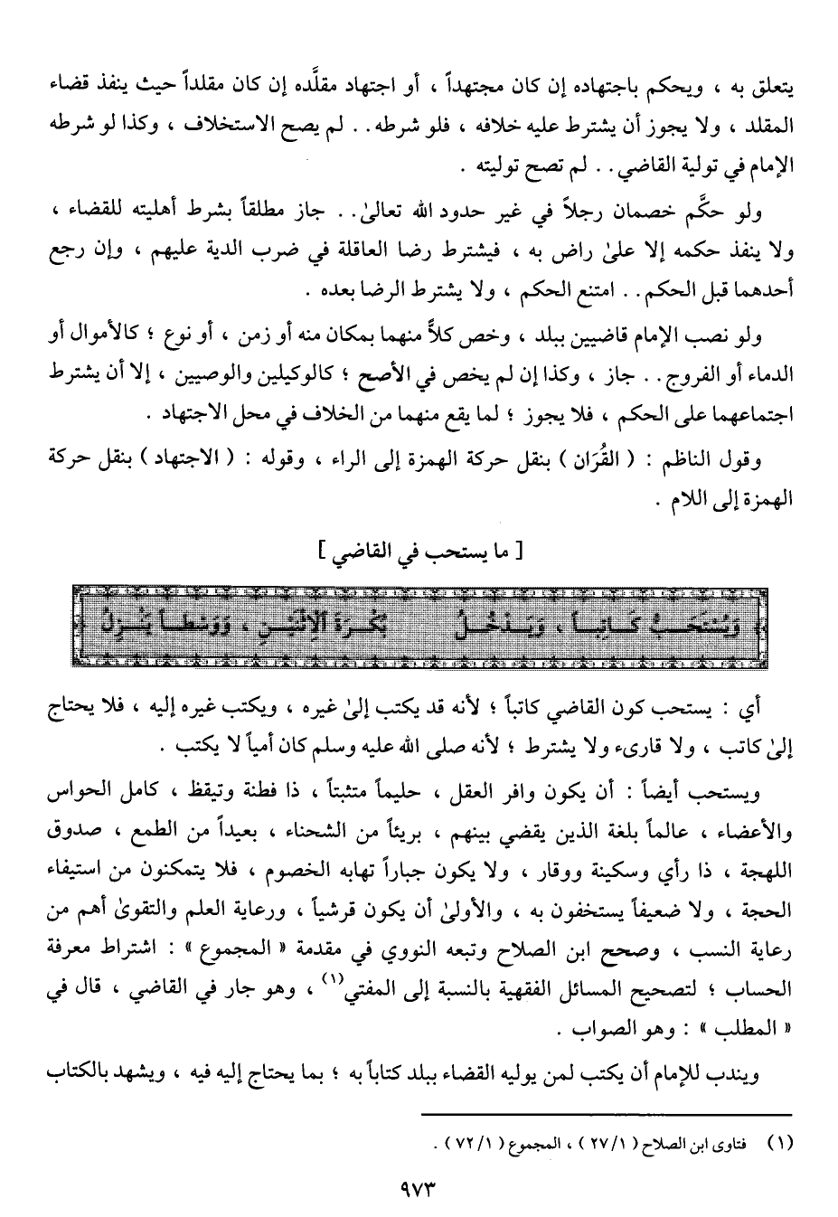 ويستحب أيضاً: أن يكون وافر العقل، حليماً متثبتاً، ذا فطنة وتيقظ، كامل الحواس والأعضاء، عالماً بلغة الذين يقضي بينهم، بريئاً من الشحناء، بعيداً من الطمع، صدوق اللهجة، ذا رأي وسكينة ووقار، ولا يكون جباراً تهابه الخصوم، فلا يتمكنون من استيفاء الحجة، ولا ضعيفاً يستخفون به، والأولى أن يكون قرشياً، ورعاية العلم والتقوى أهم من رعاية النسب، وصحح ابن الصلاح وتبعه النووي في مقدمة "المجموع": اشتراط معرفة الحساب؛ لتصحيح المسائل الفقهية بالنسبة إلى المفتي؛ وهو جار في القاضي، قال في "المطلب": وهو الصواب.