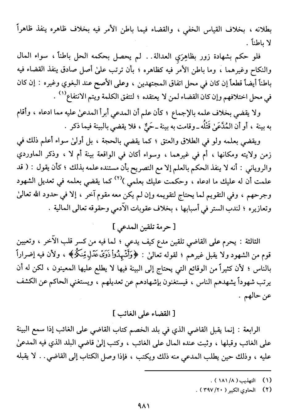 فلو حكم بشهادة زور بظاهري العدالة .. لم يحصل بحكمه الحل باطناً، سواء المال والنكاح وغيرهما، وما باطن الأمر فيه كظاهره؛ بأن ترتب على أصل صادق ينفذ القضاء فيه باطناً أيضاً قطعاً إن كان في محل اتفاق المجتهدين، وعلى الأصح عند البغوي وغيره: إن كان في محل اختلافهم وإن كان القضاء لمن لا يعتقده؛ لتتفق الكلمة ويتم الانتفاع.