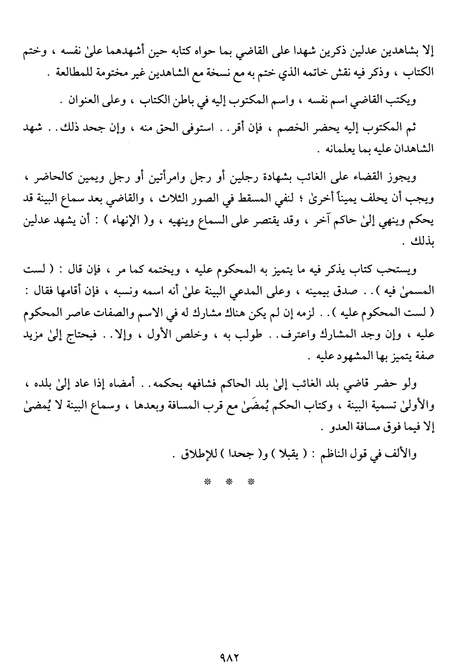 إلا بشاهدين عدلين ذكرين شهدا على القاضي بما حواه كتابه حين أشهدهما على نفسه، وختم الكتاب، وذكر فيه نقش خاتمه الذي ختم به من نسخة مع الشاهدين غير مختومة للمطالعة.