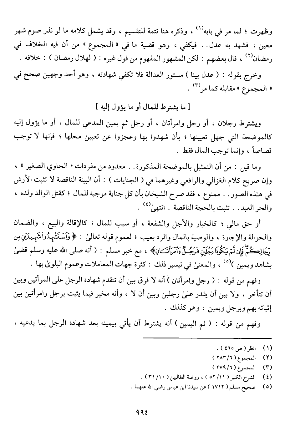 ويشترط رجلان، أو رجل وامرأتان، أو رجل ثم يمين المدعي للمال، أو ما يؤول إليه كالموضحة التي جهل تعيينها؛ بأن شهدوا بها وعجزوا عن تعيين محلها؛ فإنها لا توجب قصاصاً، وإنما تجب المال فقط.