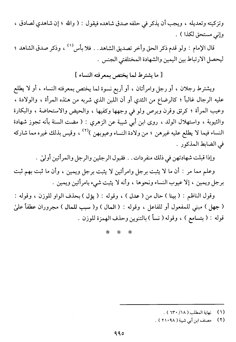 ويشترط رجلان، أو رجل وامرأتان، أو أربع نسوة لما يختص بمعرفته النساء، أو لا يطلع عليه الرجال غالباً؛ كالرضاع من الثدي أو أن اللبن الذي شربه من هذه المرأة، والولادة، وعيب المرأة؛ كرتق وقرن وبرص ولو في وجهها وكفيها، والحيض والاستحاضة، والبكارة والثيوبة، واستهلال الولد، روى ابن أبي شيبة عن الزهري: (مضت السنة بأنه تجوز شهادة النساء فيما لا يطلع عليه غيرهن؛ من ولادة النساء وعيوبهن)، وقيس بذلك غيره مما شاركه في الضابط المذكور.