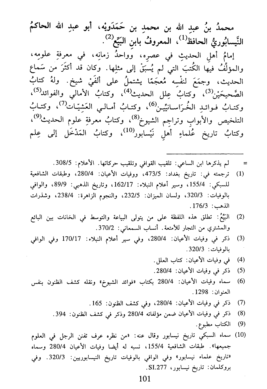 (¬10) سماه السبكي تاريخ نيسابور وقال عنه: «من نظره عرف تفنن الرجل في العلوم جميعها». طبقات الشافعية 4/ 155، نسبه له أيضا وفيات الأعيان 4/ 280 وسماه «تاريخ علماء نيسابور» وفي الوافي بالوفيات تاريخ النيسابوريين:3/ 320. وفي بروكلمان: تاريخ نيسابور. SI .277،