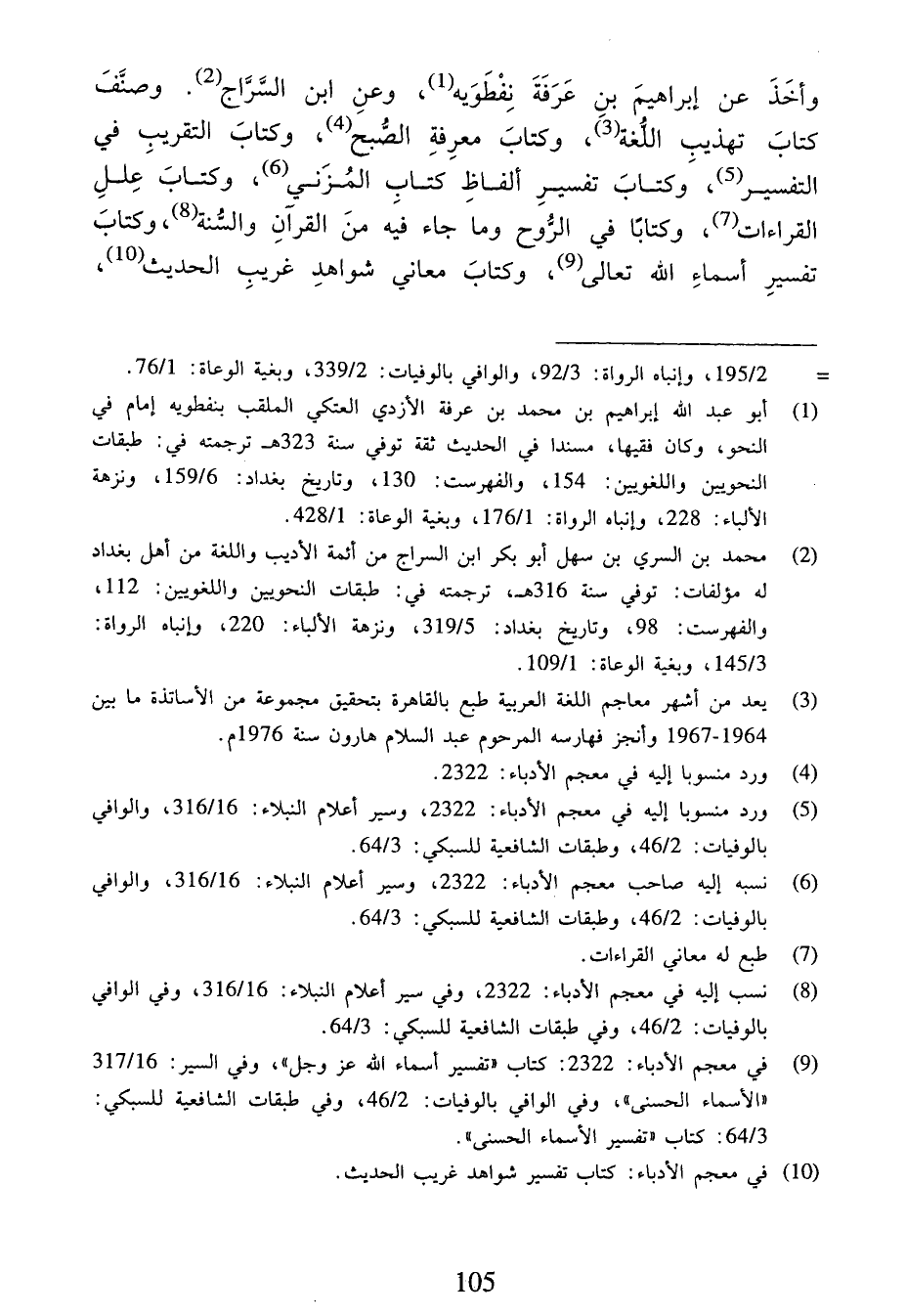 (¬1) أبو عبد الله إبراهيم بن محمد بن عرفة الأزدي العتكي الملقب بنفطويه إمام في النحو، وكان فقيها، مسندا في الحديث ثقة توفي سنة 323 هـ ترجمته في: طبقات النحويين واللغويين:154، والفهرست:130، وتاريخ بغداد:6/ 159، ونزهة الألباء:228، وإنباه الرواة:1/ 176، وبغية الوعاة:1/ 428.