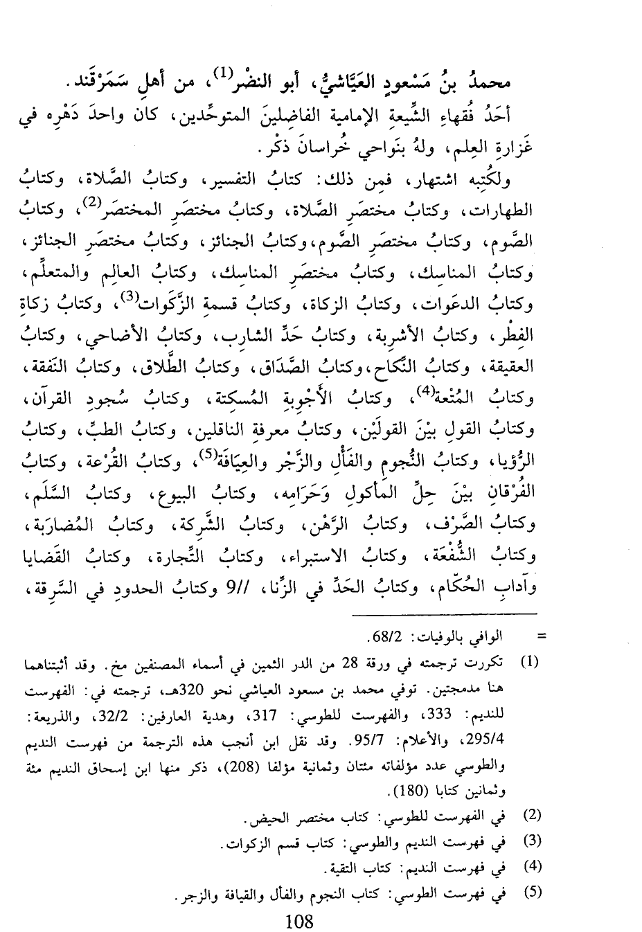 (¬1) تكررت ترجمته في ورقة 28 من الدر الثمين في أسماء المصنفين مخ. وقد أثبتناهما هنا مدمجتين. توفي محمد بن مسعود العياشي نحو 320 هـ، ترجمته في: الفهرست للنديم:333، والفهرست للطوسي:317، وهدية العارفين:2/ 32، والذريعة: 4/ 295، والأعلام:7/ 95. وقد نقل ابن أنجب هذه الترجمة من فهرست النديم والطوسي عدد مؤلفاته مائتان وثمانية مؤلفا (208)، ذكر منها ابن إسحاق النديم مائة وثمانين كتابا (180).