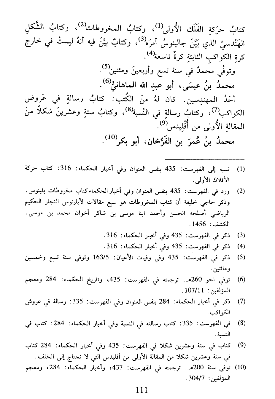 (¬6) توفي نحو 260 هـ. ترجمته في الفهرست:435، وتاريخ الحكماء:284 ومعجم المؤلفين:11/ 107.