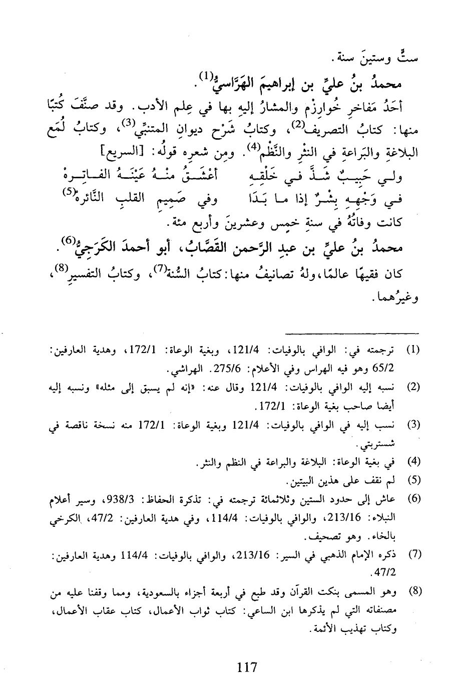 (¬6) عاش إلى حدود الستين وثلاثمائة ترجمته في: تذكرة الحفاظ:3/ 938، وسير أعلام النبلاء:16/ 213، والوافي بالوفيات:4/ 114، وفي هدية العارفين:2/ 47، الكرخي بالخاء. وهو تصحيف.