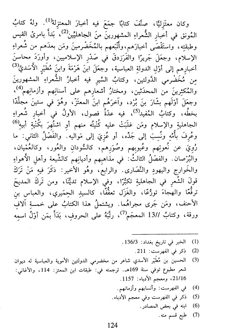 وكان معتزليّا، صنّف كتابا جمع فيه أخبار المعتزلة (¬1). وله كتاب المونق في أخبار الشّعراء المشهورين من الجاهليّين (¬2)، بدأ بامرئ القيس وطبقته، واستقصى أخبارهم، وأتبعهم بالمخضرمين ومن بعدهم من شعراء الإسلام، وجعل جريرا والفرزدق في صدر الإسلاميين، وأورد محاسن أخبارهم إلى أوّل الدولة العباسية، وجعل ابن هرمة وابن مطير الأسديّ (¬3) من مخضرمي الدّولتين، وكتاب السّير فيه أخبار الشّعراء المشهورين والمكثرين من المحدثين، ومختار أشعارهم على أسنانهم وأزمانهم (¬4)، وجعل أوّلهم بشّار بن برد، وآخرهم ابن المعتزّ، وهو في ستين مجلّدا بخطّه، وكتاب المفيد (¬5)، فيه عدّة فصول، الأول في أخبار شعراء الجاهلية والإسلام ومن غلبت عليه كنيته منهم أو اشتهر بكنية أبيه (¬6) وعرف بأمّه ونسب إلى جدّه، أو عزي إلى مواليه. والفصل الثاني: ما روي عن نعوتهم وعيوبهم وصورهم، كالسّودان والعور، وكالعميان، والبرصان. والفصل الثالث: في مذاهبهم وأديانهم كالشّيعة وأهل الأهواء والخوارج واليهود والنّصارى. والرابع، وهو الأخير: ذكر فيه من ترك قول الشّعر في الجاهلية تكبّرا، وفي الإسلام تديّنا، ومن ترك المديح ترفّعا والهجاء تورّعا، والغزل تعفّفا، كالسيد الحميري، والعباس بن الأحنف، ومن جرى مجراهما. ويشتمل هذا الكتاب على خمسة آلاف ورقة، وكتاب/13/ المعجم (¬7)، رتّبه على الحروف، بدأ بمن أوّل اسمه