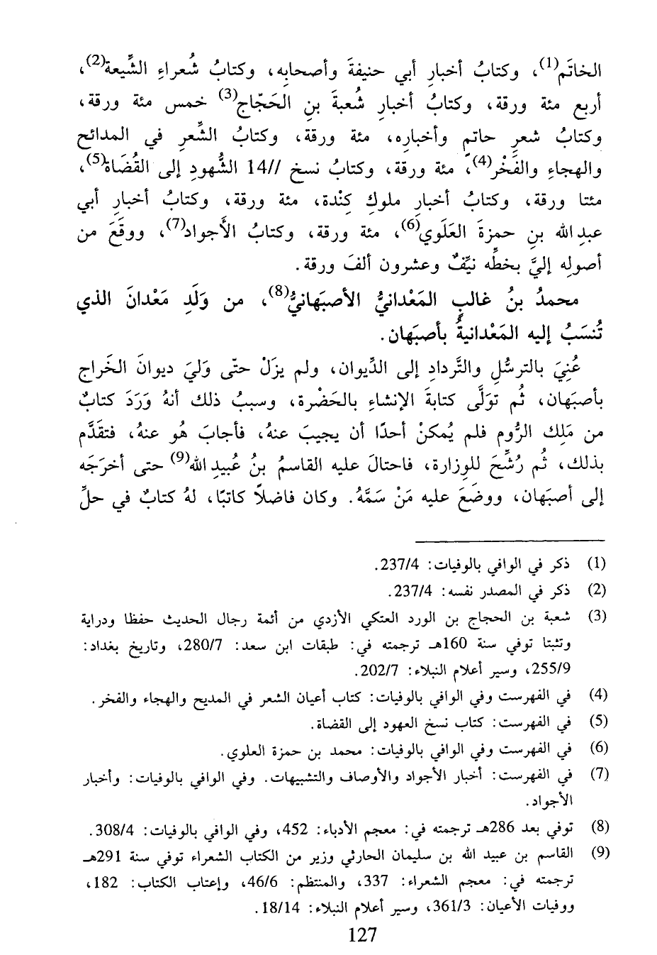 الخاتم (¬1)، وكتاب أخبار أبي حنيفة وأصحابه، وكتاب شعراء الشّيعة (¬2)، أربع مائة ورقة، وكتاب أخبار شعبة بن الحجّاج (¬3) خمس مائة ورقة، وكتاب شعر حاتم وأخباره، مائة ورقة، وكتاب الشّعر في المدائح والهجاء والفخر (¬4)، مائة ورقة، وكتاب نسخ/14/ الشّهود إلى القضاة (¬5)، مائتا ورقة، وكتاب أخبار ملوك كندة، مائة ورقة، وكتاب أخبار أبي عبد الله بن حمزة العلوي (¬6)، مائة ورقة، وكتاب الأجواد (¬7)، ووقع من أصوله إليّ بخطّه نيّف وعشرون ألف ورقة.