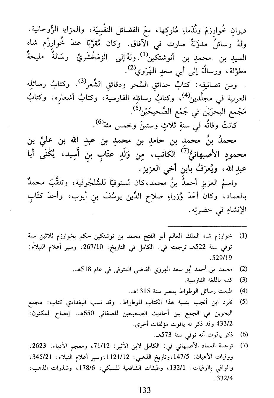 (¬7) ترجمة العماد الأصبهاني في: الكامل لابن الأثير:12/ 71، ومعجم الأدباء:2623، ووفيات الأعيان:5/ 147، وتاريخ الذهبي:12/ 1121، وسير أعلام النبلاء:21/ 345، والوافي بالوفيات:1/ 132، وطبقات الشافعية للسبكي:6/ 178، وشذرات الذهب: 4/ 332.
