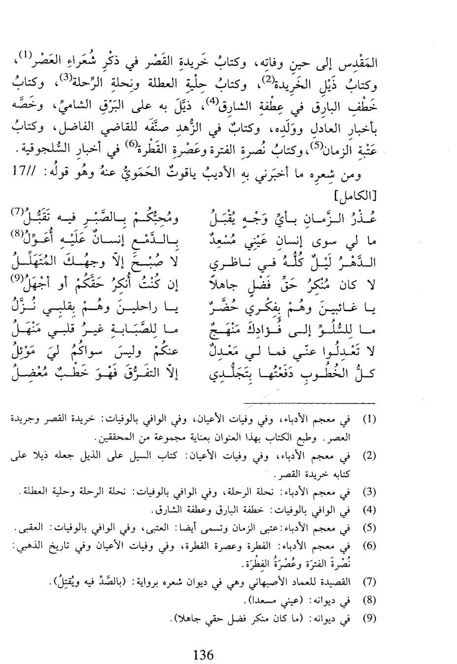 (¬1) في معجم الأدباء، وفي وفيات الأعيان، وفي الوافي بالوفيات: خريدة القصر وجريدة العصر. وطبع الكتاب بهذا العنوان بعناية مجموعة من المحققين.