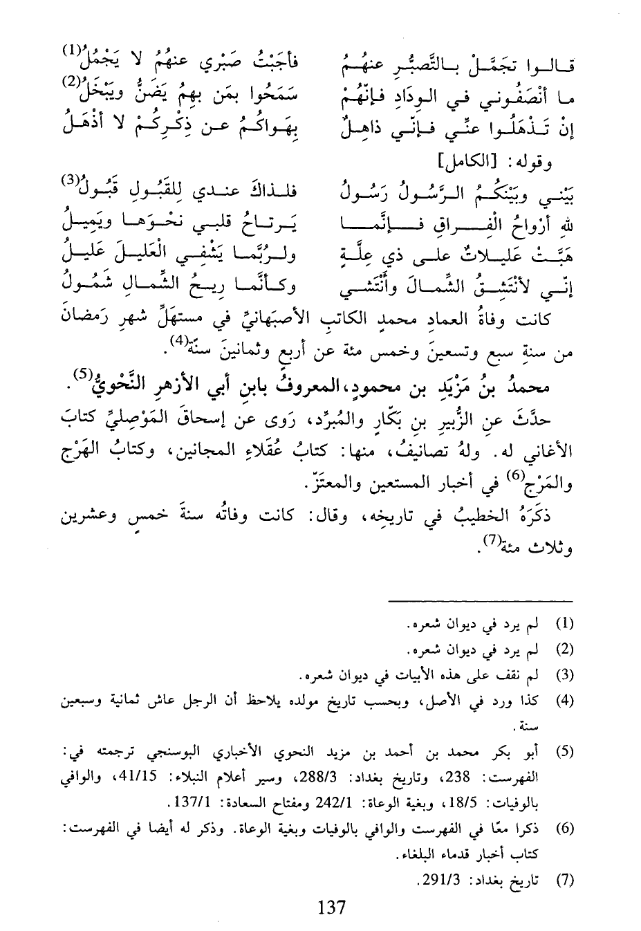 (¬5) أبو بكر محمد بن أحمد بن مزيد النحوي الأخباري البوسنجي ترجمته في: الفهرست:238، وتاريخ بغداد:3/ 288، وسير أعلام النبلاء:15/ 41، والوافي بالوفيات:5/ 18، وبغية الوعاة:1/ 242 ومفتاح السعادة:1/ 137.