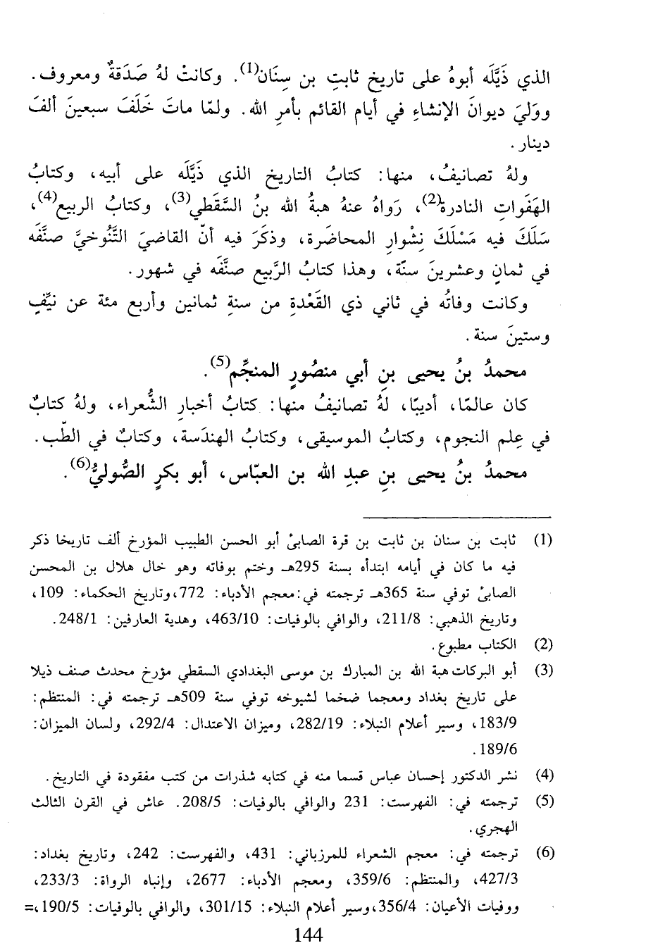 (¬1) ثابت بن سنان بن ثابت بن قرة الصابئ أبو الحسن الطبيب المؤرخ ألف تاريخا ذكر فيه ما كان في أيامه ابتدأه بسنة 295 هـ وختم بوفاته وهو خال هلال بن المحسن الصابئ توفي سنة 365 هـ ترجمته في: معجم الأدباء:772، وتاريخ الحكماء:109، وتاريخ الذهبي:8/ 211، والوافي بالوفيات:10/ 463، وهدية العارفين:1/ 248.