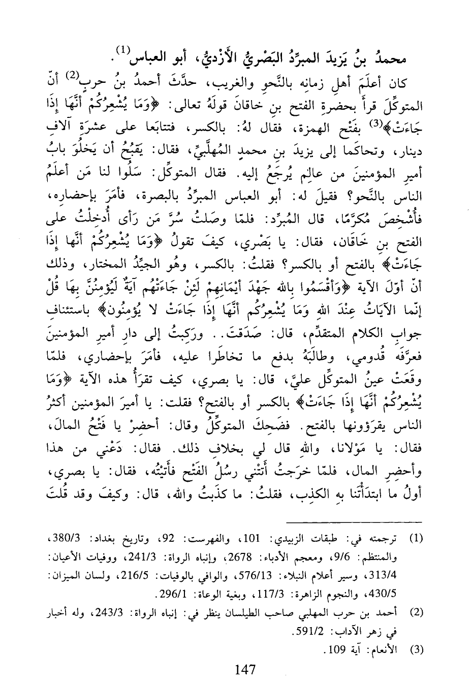 كان أعلم أهل زمانه بالنّحو والغريب، حدّث أحمد بن حرب (¬2) أنّ المتوكّل قرأ بحضرة الفتح بن خاقان قوله تعالى: {وَما يُشْعِرُكُمْ أَنَّها إِذا جاءَتْ} (¬3) بفتح الهمزة، فقال له: بالكسر، فتتابعا على عشرة آلاف دينار، وتحاكما إلى يزيد بن محمد المهلّبيّ، فقال: يقبح أن يخلو باب أمير المؤمنين من عالم يرجع إليه. فقال المتوكّل: سلوا لنا من أعلم الناس بالنّحو؟ فقيل له: أبو العباس المبرّد بالبصرة، فأمر بإحضاره، فأشخص مكرّما، قال المبرّد: فلمّا وصلت سرّ من رأى أدخلت على الفتح بن خاقان، فقال: يا بصري، كيف تقول {وَما يُشْعِرُكُمْ أَنَّها إِذا جاءَتْ} بالفتح أو بالكسر؟ فقلت: بالكسر، وهو الجيّد المختار، وذلك أنّ أوّل الآية {وَأَقْسَمُوا بِاللهِ جَهْدَ أَيْمانِهِمْ لَئِنْ جاءَتْهُمْ آيَةٌ لَيُؤْمِنُنَّ بِها قُلْ إِنَّمَا الْآياتُ عِنْدَ اللهِ وَما يُشْعِرُكُمْ أَنَّها إِذا جاءَتْ لا يُؤْمِنُونَ} باستئناف جواب الكلام المتقدّم، قال: صدقت. . وركبت إلى دار أمير المؤمنين فعرّفه قدومي، وطالبه بدفع ما تخاطرا عليه، فأمر بإحضاري، فلمّا وقعت عين المتوكّل عليّ، قال: يا بصري، كيف تقرأ هذه الآية {وَما يُشْعِرُكُمْ أَنَّها إِذا جاءَتْ} بالكسر أو بالفتح؟ فقلت: يا أمير المؤمنين أكثر الناس يقرءونها بالفتح. فضحك المتوكّل وقال: أحضر يا فتح المال، فقال: يا مولانا، والله قال لي بخلاف ذلك. فقال: دعني من هذا وأحضر المال، فلمّا خرجت أتتني رسل الفتح فأتيته، فقال: يا بصري، أول ما ابتدأتنا به الكذب، فقلت: ما كذبت والله، قال: وكيف وقد قلت