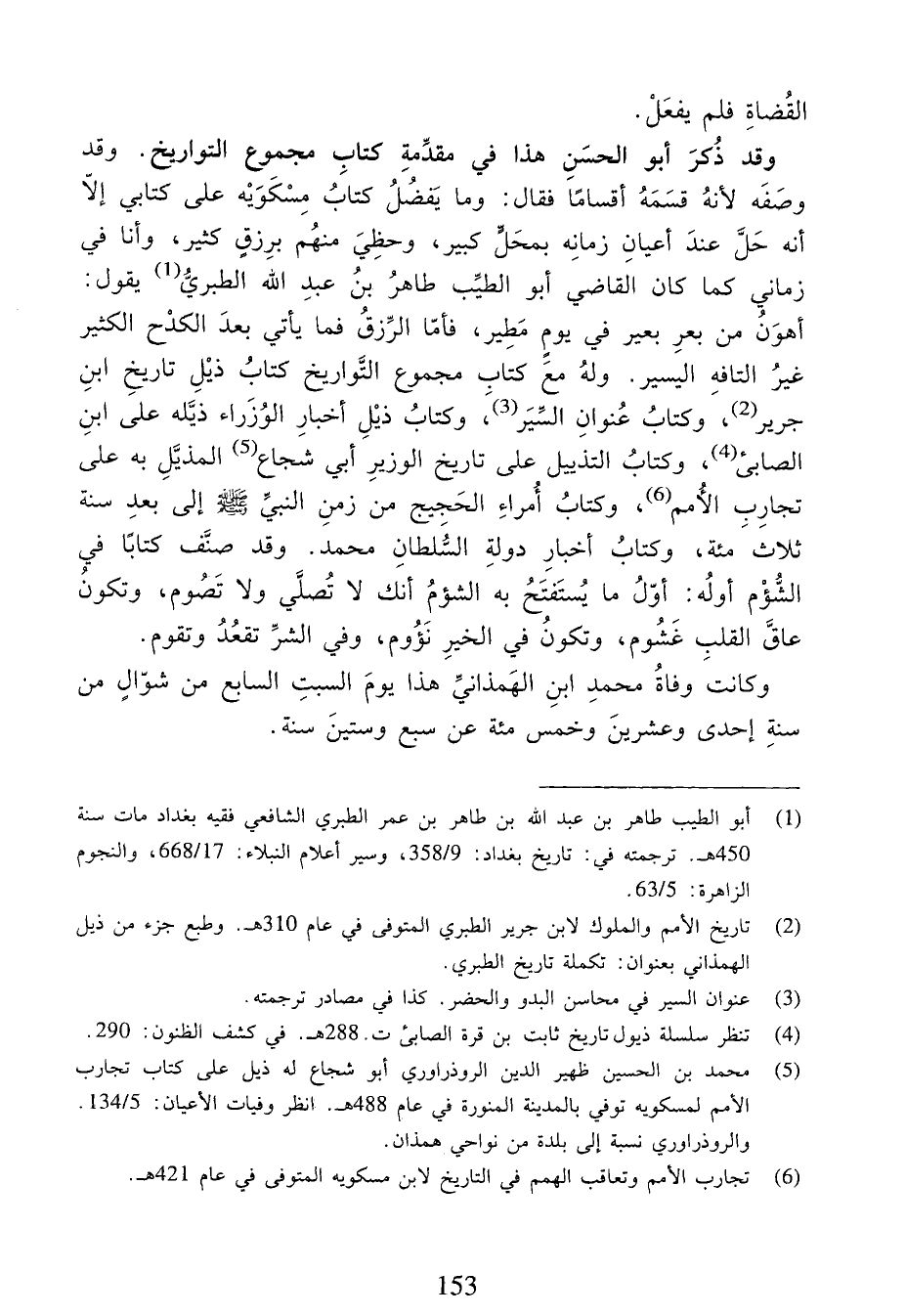(¬5) محمد بن الحسين ظهير الدين الروذراوري أبو شجاع له ذيل على كتاب تجارب الأمم لمسكويه توفي بالمدينة المنورة في عام 488 هـ. انظر وفيات الأعيان:5/ 134. والروذراوري نسبة إلى بلدة من نواحي همذان.