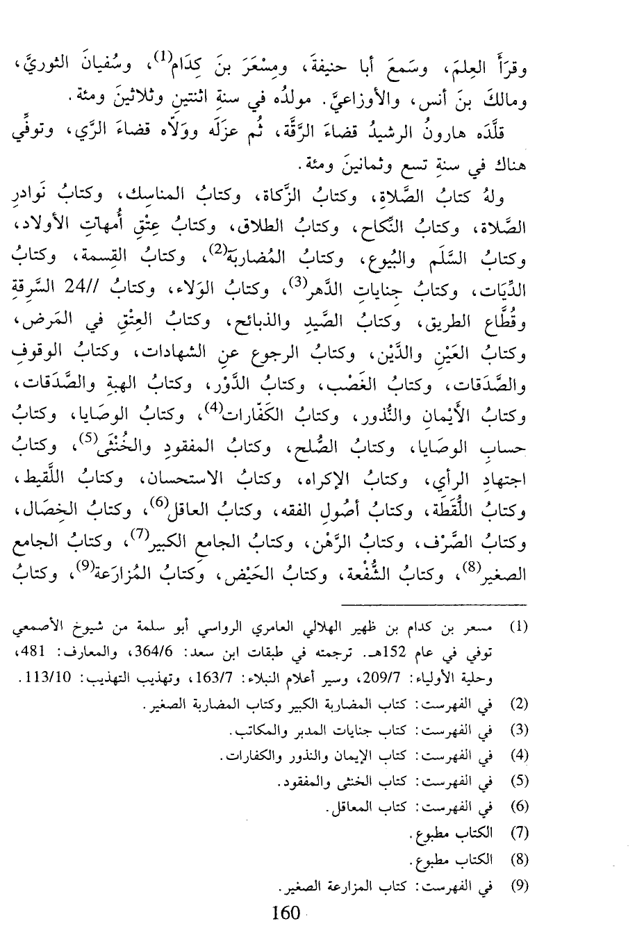 وله كتاب الصّلاة، وكتاب الزّكاة، وكتاب المناسك، وكتاب نوادر الصّلاة، وكتاب النّكاح، وكتاب الطلاق، وكتاب عتق أمهات الأولاد، وكتاب السّلم والبيوع، وكتاب المضاربة (¬2)، وكتاب القسمة، وكتاب الدّيات، وكتاب جنايات الدّهر (¬3)، وكتاب الولاء، وكتاب/24/ السّرقة وقطّاع الطريق، وكتاب الصّيد والذبائح، وكتاب العتق في المرض، وكتاب العين والدّين، وكتاب الرجوع عن الشهادات، وكتاب الوقوف والصّدقات، وكتاب الغصب، وكتاب الدّور، وكتاب الهبة والصّدقات، وكتاب الأيمان والنّذور، وكتاب الكفّارات (¬4)، وكتاب الوصايا، وكتاب حساب الوصايا، وكتاب الصّلح، وكتاب المفقود والخنثى (¬5)، وكتاب اجتهاد الرأي، وكتاب الإكراه، وكتاب الاستحسان، وكتاب اللّقيط، وكتاب اللّقطة، وكتاب أصول الفقه، وكتاب العاقل (¬6)، وكتاب الخصال، وكتاب الصّرف، وكتاب الرّهن، وكتاب الجامع الكبير (¬7)، وكتاب الجامع الصغير (¬8)، وكتاب الشّفعة، وكتاب الحيض، وكتاب المزارعة (¬9)، وكتاب