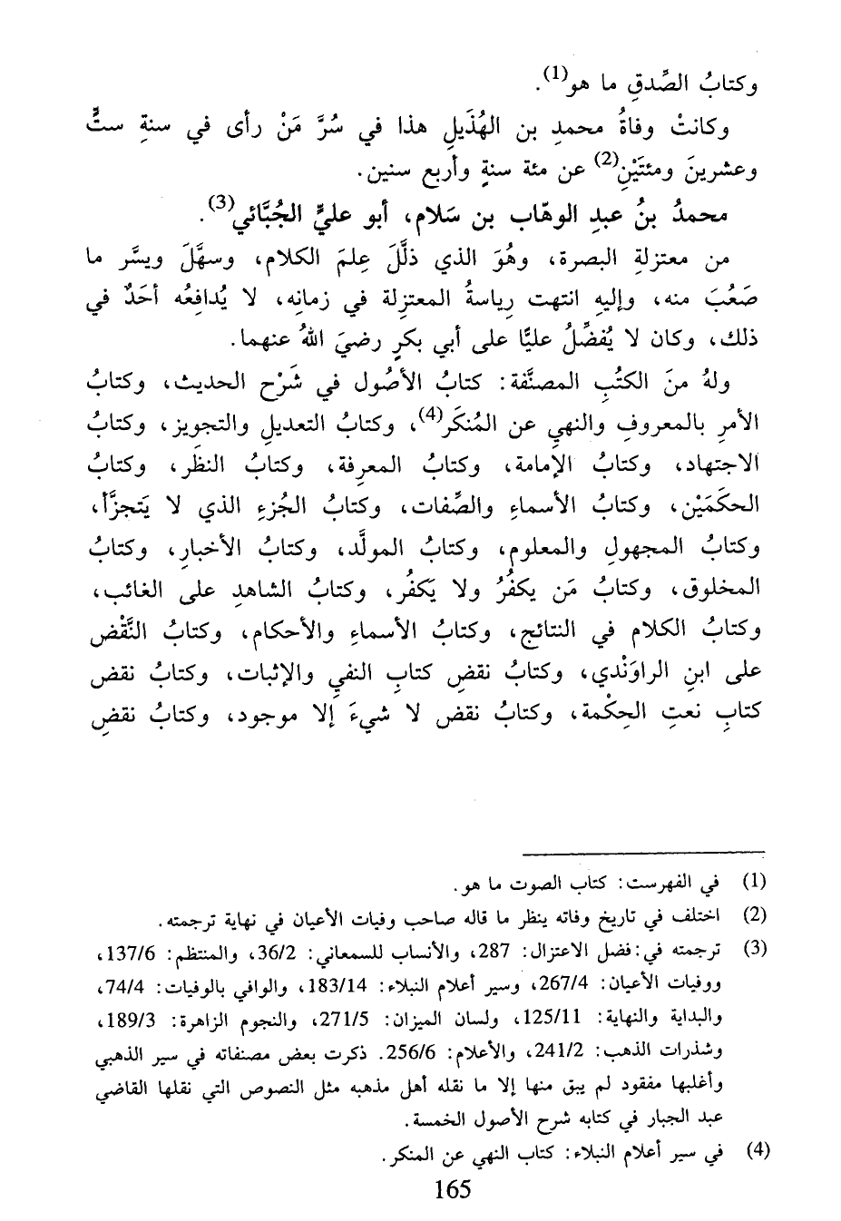 (¬3) ترجمته في: فضل الاعتزال:287، والأنساب للسمعاني:2/ 36، والمنتظم:6/ 137، ووفيات الأعيان:4/ 267، وسير أعلام النبلاء:14/ 183، والوافي بالوفيات:4/ 74، والبداية والنهاية:11/ 125، ولسان الميزان:5/ 271، والنجوم الزاهرة:3/ 189، وشذرات الذهب:2/ 241، والأعلام:6/ 256. ذكرت بعض مصنفاته في سير الذهبي وأغلبها مفقود لم يبق منها إلا ما نقله أهل مذهبه مثل النصوص التي نقلها القاضي عبد الجبار في كتابه شرح الأصول الخمسة.