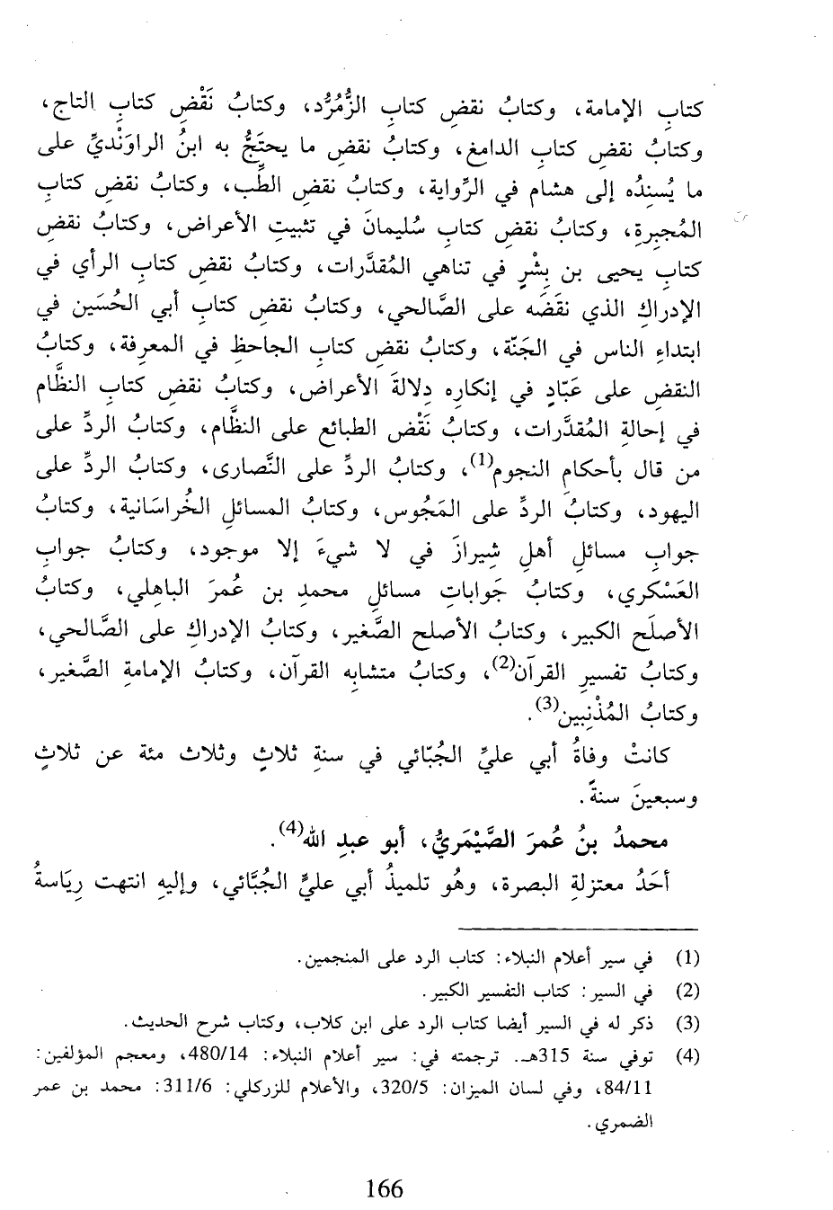 كتاب الإمامة، وكتاب نقض كتاب الزّمرّد، وكتاب نقض كتاب التاج، وكتاب نقض كتاب الدامغ، وكتاب نقض ما يحتجّ به ابن الراونديّ على ما يسنده إلى هشام في الرّواية، وكتاب نقض الطّب، وكتاب نقض كتاب المجبرة، وكتاب نقض كتاب سليمان في تثبيت الأعراض، وكتاب نقض كتاب يحيى بن بشر في تناهي المقدّرات، وكتاب نقض كتاب الرأي في الإدراك الذي نقضه على الصّالحي، وكتاب نقض كتاب أبي الحسين في ابتداء الناس في الجنّة، وكتاب نقض كتاب الجاحظ في المعرفة، وكتاب النقض على عبّاد في إنكاره دلالة الأعراض، وكتاب نقض كتاب النظّام في إحالة المقدّرات، وكتاب نقض الطبائع على النظّام، وكتاب الردّ على من قال بأحكام النجوم (¬1)، وكتاب الردّ على النّصارى، وكتاب الردّ على اليهود، وكتاب الردّ على المجوس، وكتاب المسائل الخراسانية، وكتاب جواب مسائل أهل شيراز في لا شيء إلا موجود، وكتاب جواب العسكري، وكتاب جوابات مسائل محمد بن عمر الباهلي، وكتاب الأصلح الكبير، وكتاب الأصلح الصّغير، وكتاب الإدراك على الصّالحي، وكتاب تفسير القرآن (¬2)، وكتاب متشابه القرآن، وكتاب الإمامة الصّغير، وكتاب المذنبين (¬3).