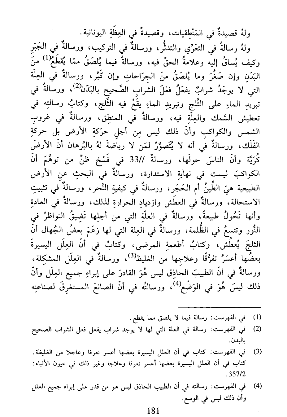 وله رسالة في التعرّي والتدثّر، ورسالة في التركيب، ورسالة في الجبر وكيف يساق إليه وعلامة الحقّ فيه، ورسالة فيما يلصق ممّا يقطع (¬1) من البدن وإن صغر وما يلصق من الجراحات وإن كبر، ورسالة في العلّة التي لا يوجد شراب يفعل فعل الشراب الصّحيح بالبدن (¬2)، ورسالة في تبريد الماء على الثّلج وتبريد الماء يقع فيه الثّلج، وكتاب رسالته في تعطيش السّمك والعلّة فيه، ورسالة في المنطق، ورسالة في غروب الشمس والكواكب وأنّ ذلك ليس من أجل حركة الأرض بل حركة الفلك، ورسالة في أنه لا يتصوّر لمن لا رياضة له بالبرهان أنّ الأرض كريّة وأنّ الناس حولها، ورسالة/33/ في فسخ ظنّ من توهّم أنّ الكواكب ليست في نهاية الاستدارة، ورسالة في البحث عن الأرض الطبيعية هي الطّين أم الحجر، ورسالة في كيفية النّحر، ورسالة في تثبيت الاستحالة، ورسالة في العطش وازدياد الحرارة لذلك، ورسالة في العادة وأنها تحول طبيعة، ورسالة في العلّة التي من أجلها تضيق النواظر في النّور وتتسع في الظّلمة، ورسالة في العلة التي لها زعم بعض الجهال أنّ الثلج يعطّش، وكتاب أطعمة المرضى، وكتاب في أنّ العلل اليسيرة بعضها أعسر تفرّقا وعلاجها من الغليظ (¬3)، ورسالة في العلل المشكلة، ورسالة في أنّ الطبيب الحاذق ليس هو القادر على إبراء جميع العلل وأنّ ذلك ليس هو في الوضع (¬4)، ورسالته في أنّ الصانع المستغرق لصناعته