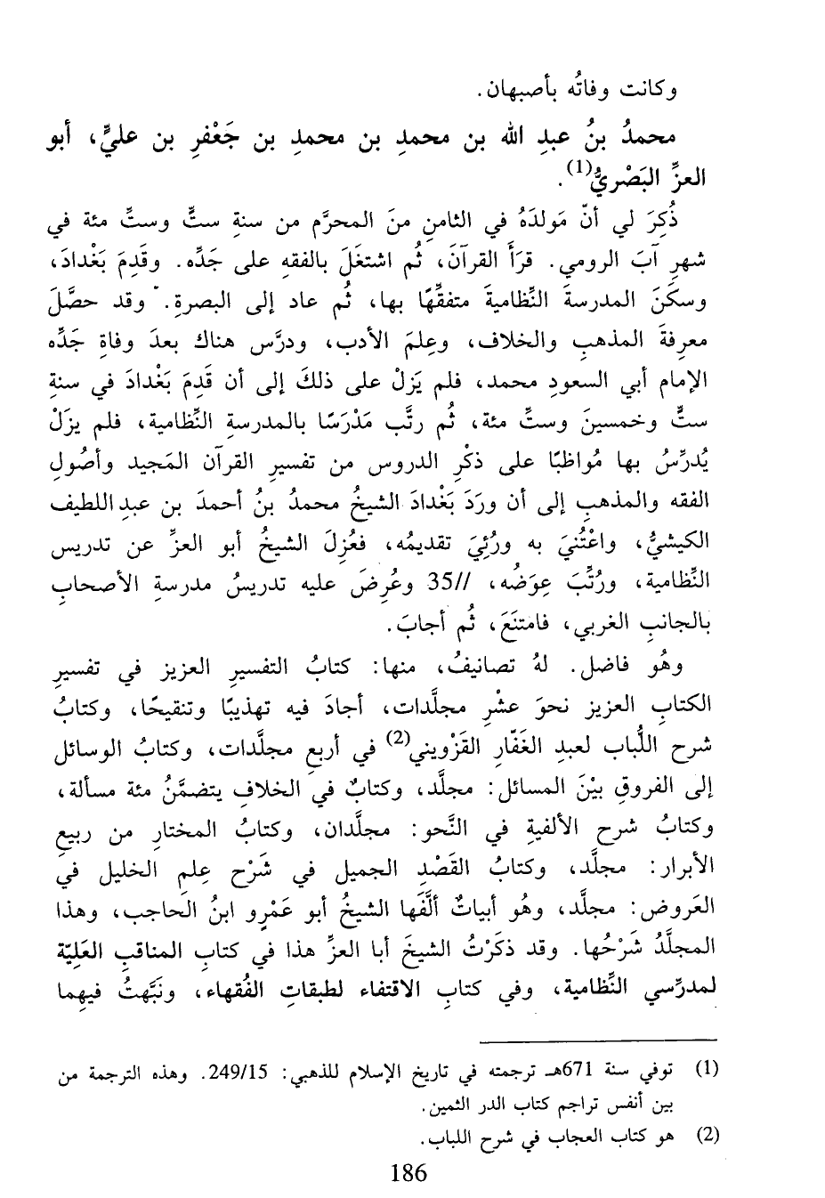 وهو فاضل. له تصانيف، منها: كتاب التفسير العزيز في تفسير الكتاب العزيز نحو عشر مجلّدات، أجاد فيه تهذيبا وتنقيحا، وكتاب شرح اللّباب لعبد الغفّار القزويني (¬2) في أربع مجلّدات، وكتاب الوسائل إلى الفروق بين المسائل: مجلّد، وكتاب في الخلاف يتضمّن مائة مسألة، وكتاب شرح الألفية في النّحو: مجلّدان، وكتاب المختار من ربيع الأبرار: مجلّد، وكتاب القصد الجميل في شرح علم الخليل في العروض: مجلّد، وهو أبيات ألّفها الشيخ أبو عمرو ابن الحاجب، وهذا المجلّد شرحها. وقد ذكرت الشيخ أبا العزّ هذا في كتاب المناقب العليّة لمدرّسي النّظامية، وفي كتاب الاقتفاء لطبقات الفقهاء، ونبّهت فيهما