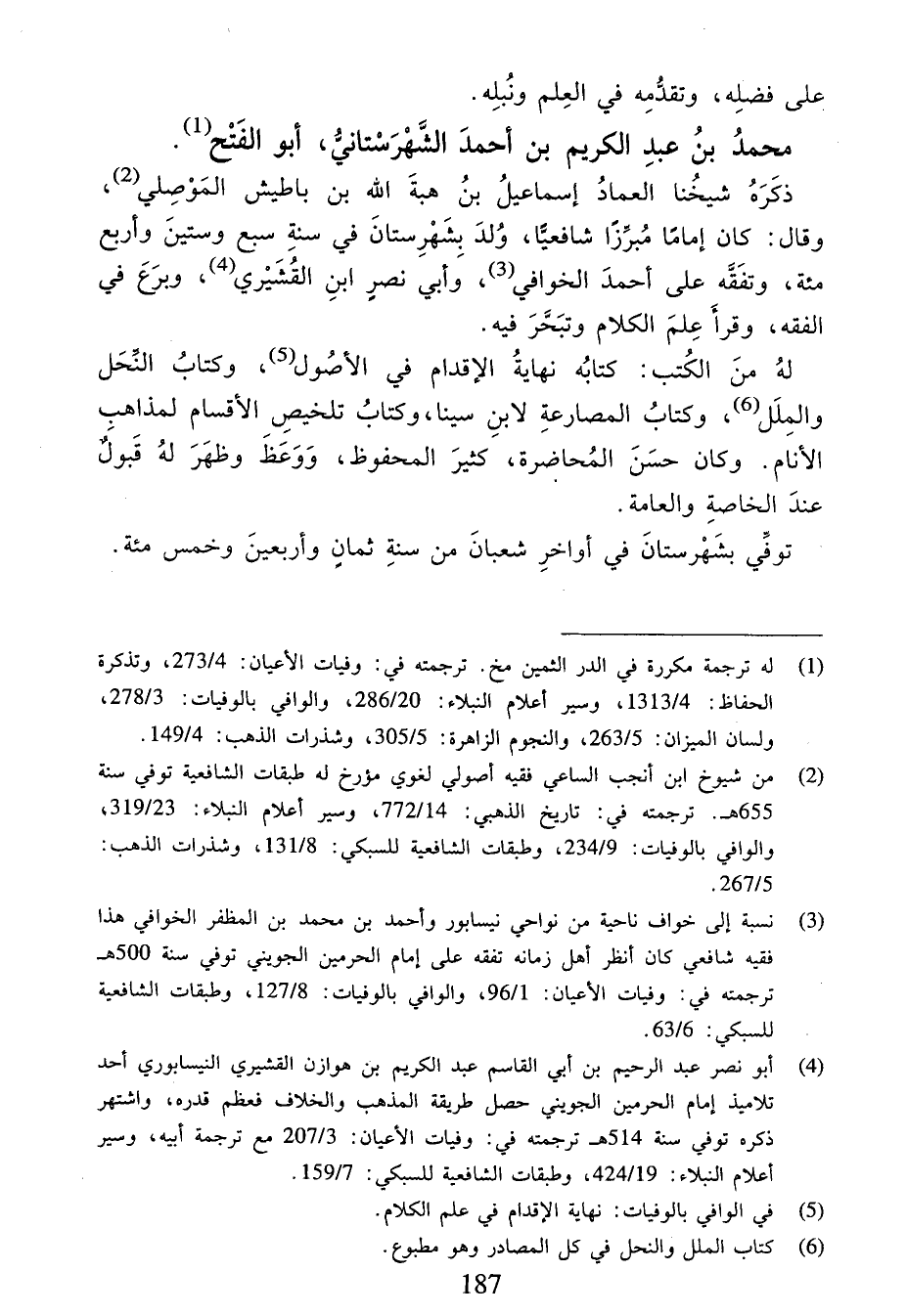 (¬5) في الوافي بالوفيات: نهاية الإقدام في علم الكلام.