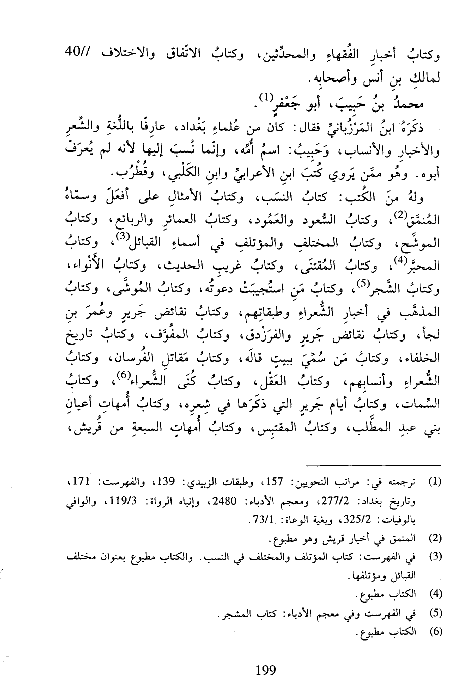 وله من الكتب: كتاب النسب، وكتاب الأمثال على أفعل وسمّاه المنمّق (¬2)، وكتاب السّعود والعمود، وكتاب العمائر والربائع، وكتاب الموشّح، وكتاب المختلف والمؤتلف في أسماء القبائل (¬3)، وكتاب المحبّر (¬4)، وكتاب المقتنى، وكتاب غريب الحديث، وكتاب الأنواء، وكتاب الشّجر (¬5)، وكتاب من استجيبت دعوته، وكتاب الموشّى، وكتاب المذهّب في أخبار الشّعراء وطبقاتهم، وكتاب نقائض جرير وعمر بن لجأ، وكتاب نقائض جرير والفرزدق، وكتاب المفوّف، وكتاب تاريخ الخلفاء، وكتاب من سمّي ببيت قاله، وكتاب مقاتل الفرسان، وكتاب الشّعراء وأنسابهم، وكتاب العقل، وكتاب كنى الشّعراء (¬6)، وكتاب السّمات، وكتاب أيام جرير التي ذكرها في شعره، وكتاب أمهات أعيان بني عبد المطّلب، وكتاب المقتبس، وكتاب أمهات السبعة من قريش،