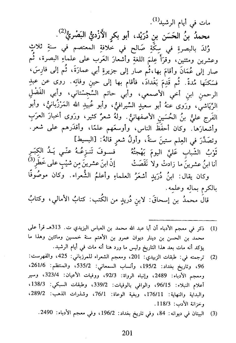(¬2) ترجمته في: طبقات الزبيدي:201، ومعجم الشعراء للمرزباني:425، والفهرست: 96، وتاريخ بغداد:2/ 195، وأنساب السمعاني:2/ 535، والمنتظم:6/ 261، ومعجم الأدباء:2489، وإنباه الرواة:3/ 92، ووفيات الأعيان:4/ 323، وسير أعلام النبلاء:15/ 96، والوافي بالوفيات:2/ 339، وطبقات السبكي:3/ 138، والبداية والنهاية:11/ 176، وبغية الوعاة:1/ 76، وشذرات الذهب:2/ 289، وخزانة الأدب:3/ 118.