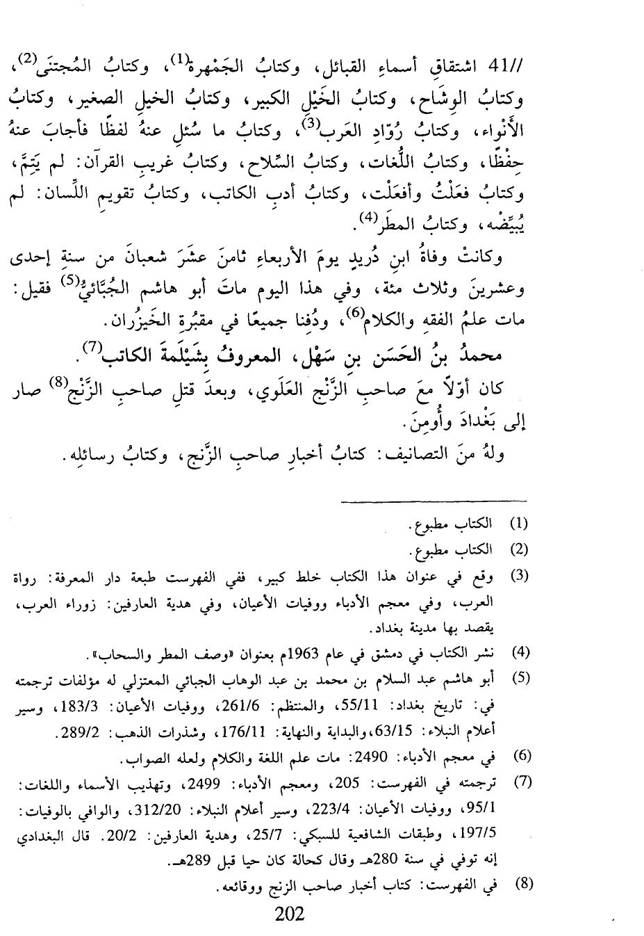 (¬3) وقع في عنوان هذا الكتاب خلط كبير، ففي الفهرست طبعة دار المعرفة: رواة العرب، وفي معجم الأدباء ووفيات الأعيان، وفي هدية العارفين: زوراء العرب، يقصد بها مدينة بغداد.