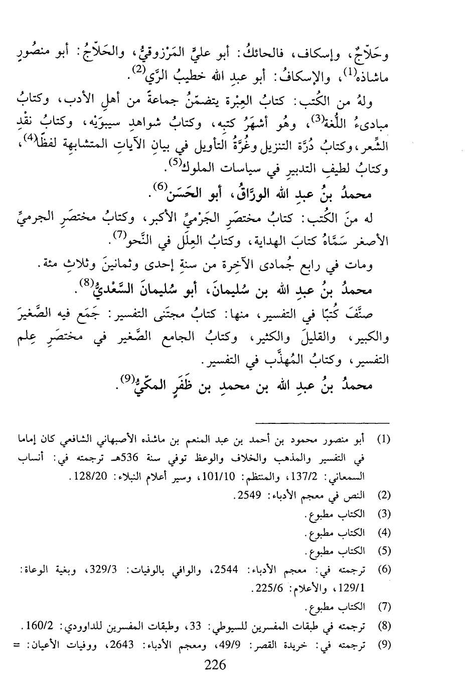 (¬6) ترجمته في: معجم الأدباء:2544، والوافي بالوفيات:3/ 329، وبغية الوعاة: 1/ 129، والأعلام:6/ 225.