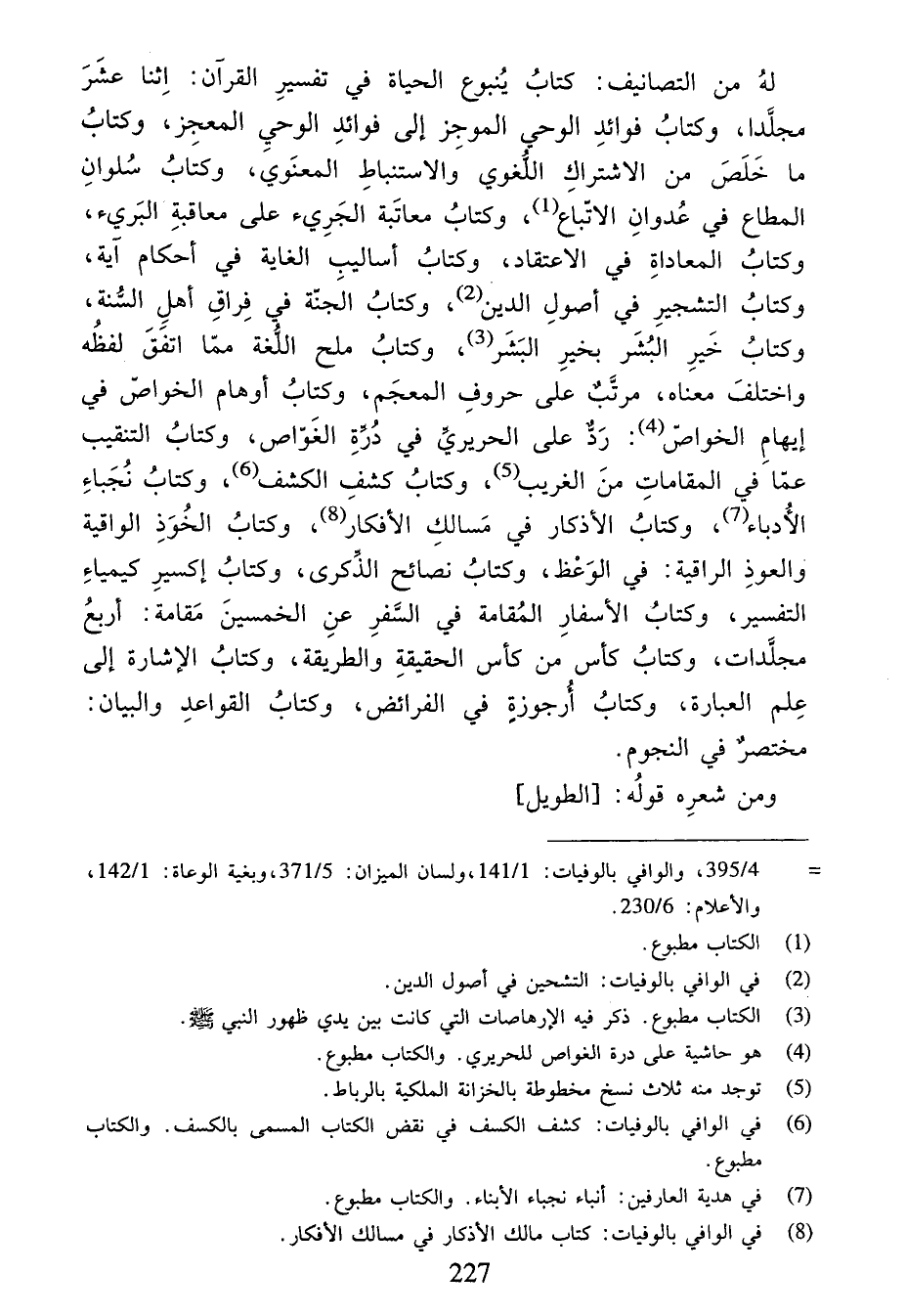 له من التصانيف: كتاب ينبوع الحياة في تفسير القرآن: اثنا عشر مجلّدا، وكتاب فوائد الوحي الموجز إلى فوائد الوحي المعجز، وكتاب ما خلص من الاشتراك اللّغوي والاستنباط المعنوي، وكتاب سلوان المطاع في عدوان الاتّباع (¬1)، وكتاب معاتبة الجريء على معاقبة البريء، وكتاب المعاداة في الاعتقاد، وكتاب أساليب الغاية في أحكام آية، وكتاب التشجير في أصول الدين (¬2)، وكتاب الجنّة في فراق أهل السّنة، وكتاب خير البشر بخير البشر (¬3)، وكتاب ملح اللّغة ممّا اتفق لفظه واختلف معناه، مرتّب على حروف المعجم، وكتاب أوهام الخواصّ في إيهام الخواصّ (¬4): ردّ على الحريريّ في درّة الغوّاص، وكتاب التنقيب عمّا في المقامات من الغريب (¬5)، وكتاب كشف الكشف (¬6)، وكتاب نجباء الأدباء (¬7)، وكتاب الأذكار في مسالك الأفكار (¬8)، وكتاب الخوذ الواقية والعوذ الراقية: في الوعظ، وكتاب نصائح الذّكرى، وكتاب إكسير كيمياء التفسير، وكتاب الأسفار المقامة في السّفر عن الخمسين مقامة: أربع مجلّدات، وكتاب كأس من كأس الحقيقة والطريقة، وكتاب الإشارة إلى علم العبارة، وكتاب أرجوزة في الفرائض، وكتاب القواعد والبيان: