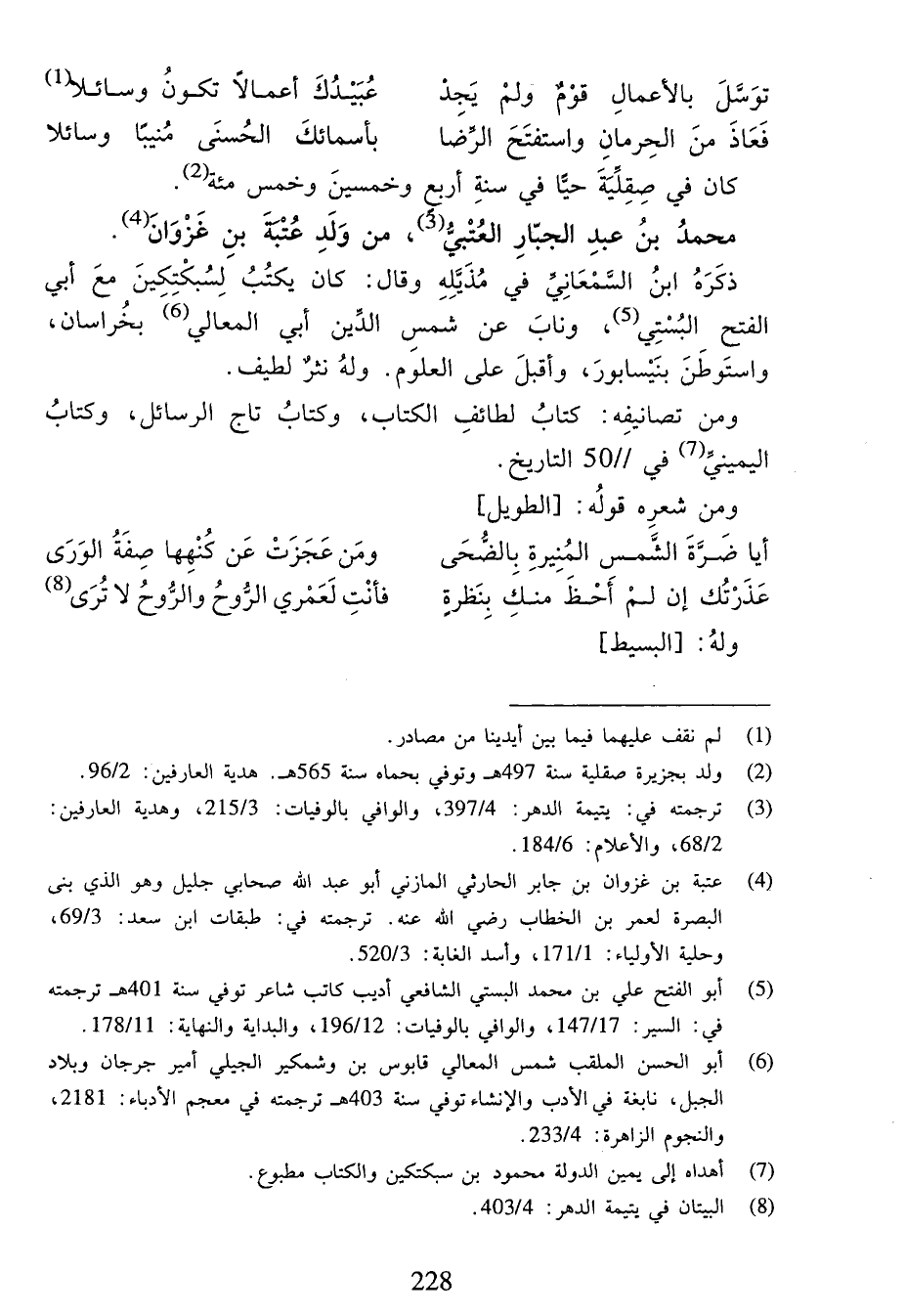 (¬3) ترجمته في: يتيمة الدهر:4/ 397، والوافي بالوفيات:3/ 215، وهدية العارفين: 2/ 68، والأعلام:6/ 184.