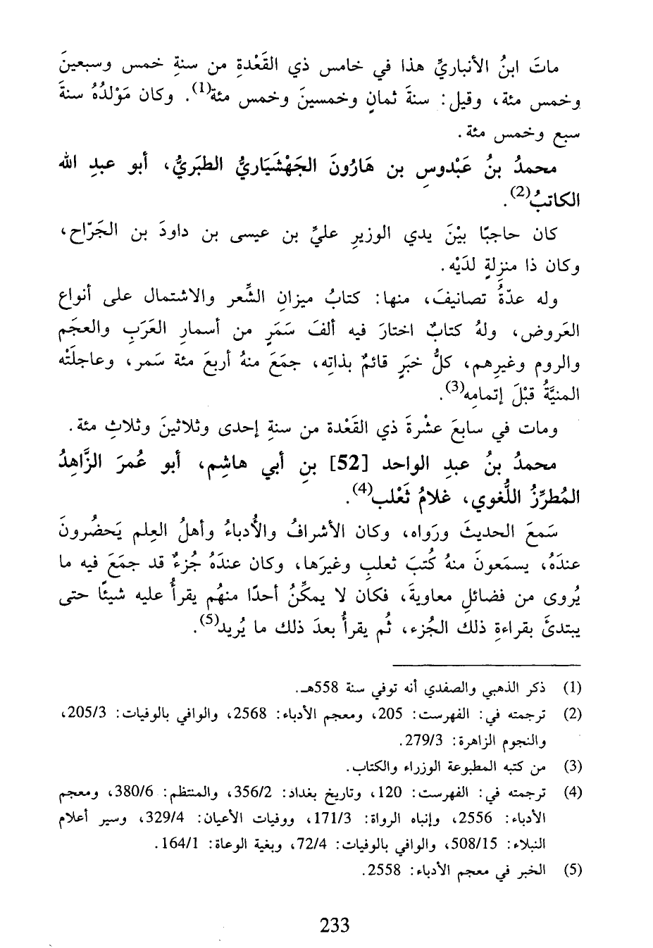 (¬4) ترجمته في: الفهرست:120، وتاريخ بغداد:2/ 356، والمنتظم:6/ 380، ومعجم الأدباء:2556، وإنباه الرواة:3/ 171، ووفيات الأعيان:4/ 329، وسير أعلام النبلاء:15/ 508، والوافي بالوفيات:4/ 72، وبغية الوعاة:1/ 164.