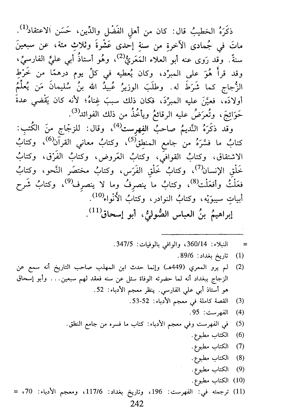 (¬2) لم يرو المعري (449 هـ) وإنما حدث ابن المهذب صاحب التاريخ أنه سمع عن الزجاج ببغداد أنه لما حضرته الوفاة سئل عن سنه فعقد لهم سبعين. . . وأبو إسحاق هو أستاذ أبي علي الفارسي. ينظر معجم الأدباء:52.