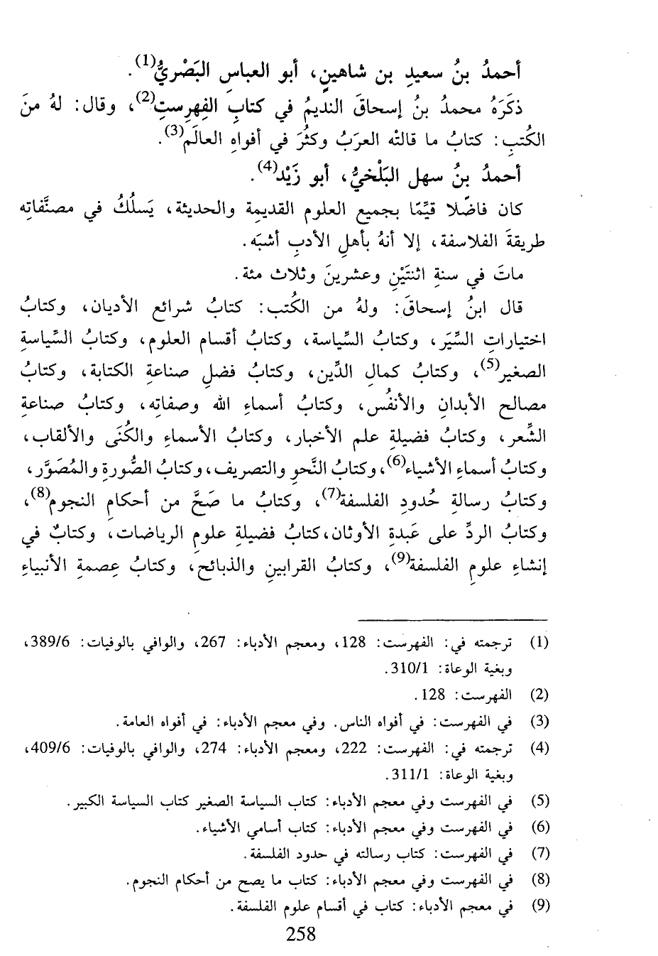 (¬4) ترجمته في: الفهرست:222، ومعجم الأدباء:274، والوافي بالوفيات:6/ 409، وبغية الوعاة:1/ 311.