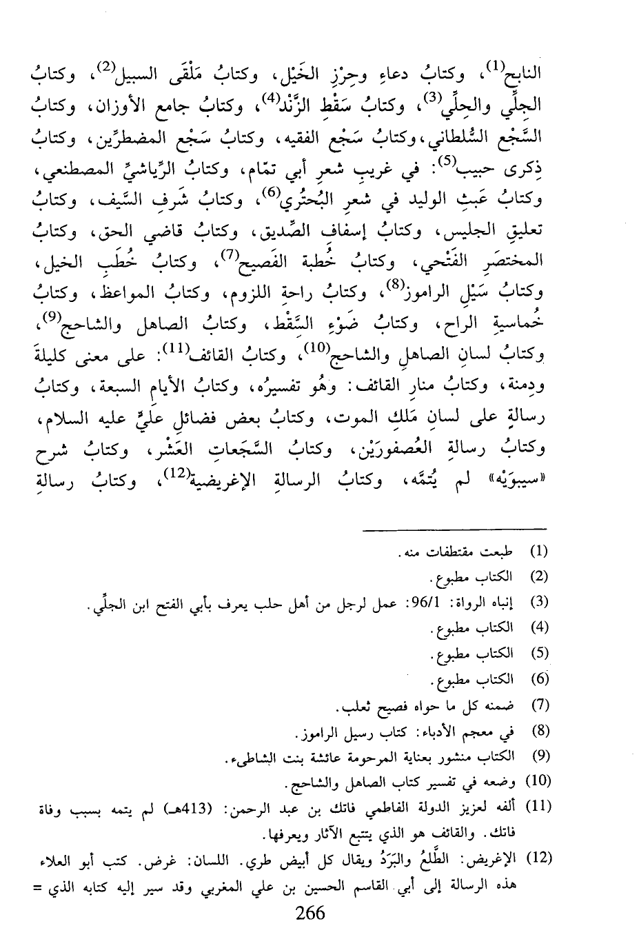 النابح (¬1)، وكتاب دعاء وحرز الخيل، وكتاب ملقى السبيل (¬2)، وكتاب الجلي والحلّي (¬3)، وكتاب سقط الزّند (¬4)، وكتاب جامع الأوزان، وكتاب السّجع السّلطاني، وكتاب سجع الفقيه، وكتاب سجع المضطرّين، وكتاب ذكرى حبيب (¬5): في غريب شعر أبي تمّام، وكتاب الرّياشيّ المصطنعي، وكتاب عبث الوليد في شعر البحتري (¬6)، وكتاب شرف السّيف، وكتاب تعليق الجليس، وكتاب إسفاف الصّديق، وكتاب قاضي الحق، وكتاب المختصر الفتحي، وكتاب خطبة الفصيح (¬7)، وكتاب خطب الخيل، وكتاب سيل الراموز (¬8)، وكتاب راحة اللزوم، وكتاب المواعظ، وكتاب خماسية الراح، وكتاب ضوء السّقط، وكتاب الصاهل والشاحج (¬9)، وكتاب لسان الصاهل والشاحج (¬10)، وكتاب القائف (¬11): على معنى كليلة ودمنة، وكتاب منار القائف: وهو تفسيره، وكتاب الأيام السبعة، وكتاب رسالة على لسان ملك الموت، وكتاب بعض فضائل عليّ عليه السلام، وكتاب رسالة العصفورين، وكتاب السّجعات العشر، وكتاب شرح «سيبويه» لم يتمّه، وكتاب الرسالة الإغريضية (¬12)، وكتاب رسالة