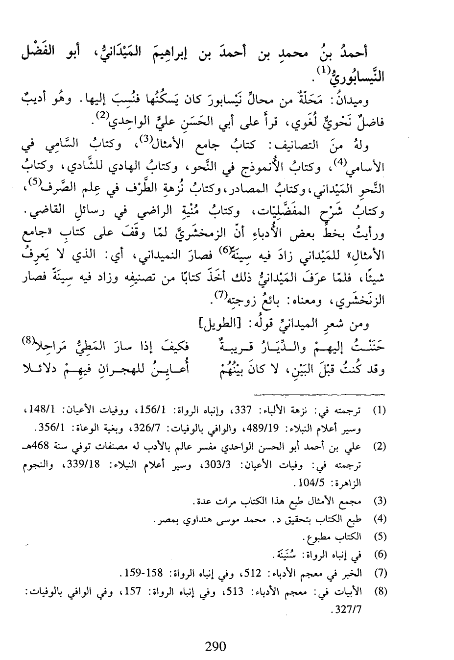 وميدان: محلّة من محال نيسابور كان يسكنها فنسب إليها. وهو أديب فاضل نحويّ لغوي، قرأ على أبي الحسن عليّ الواحدي (¬2).