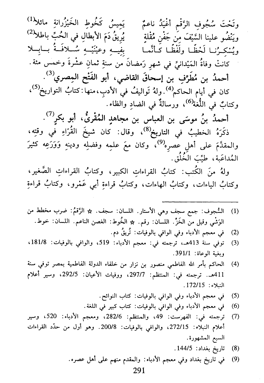(¬7) ترجمته في: الفهرست:49، والمنتظم:6/ 282، ومعجم الأدباء:520، وسير أعلام النبلاء:15/ 272، والوافي بالوفيات:8/ 200. وهو أول من حدّد القراءات السبع المشهورة.